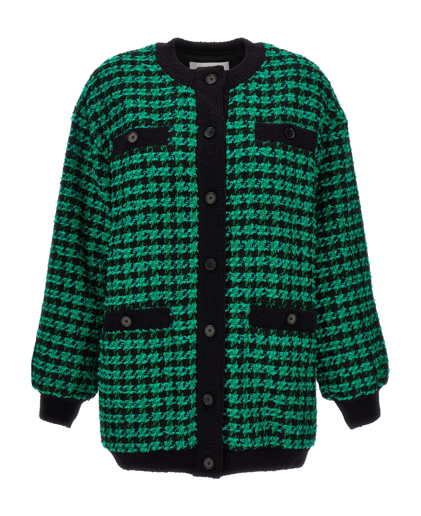 Tweed cardigan, pockets, button closure, long cuffed sleeves.