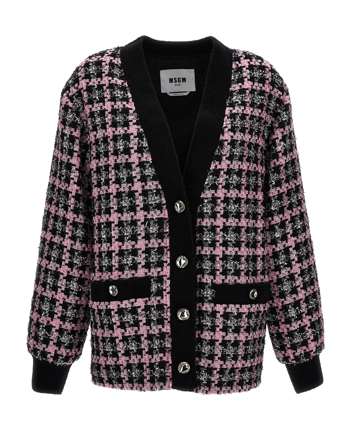 Tweed cardigan, button closure, pockets, long cuffed sleeves.