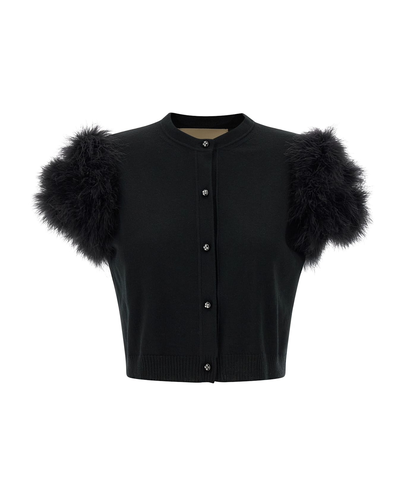 Wool knit cardigan, crew neck, front closure with jewel buttons, feather detail on the shoulders, sleeveless. Composition: 100% virgin wool