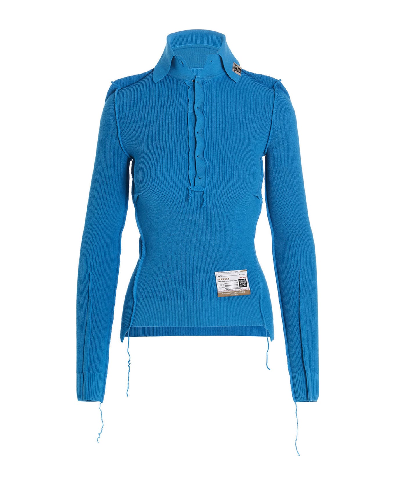 Cotton blend sweater with visible stitching, a polo collar, a removable high collar, long sleeves, used effect details.