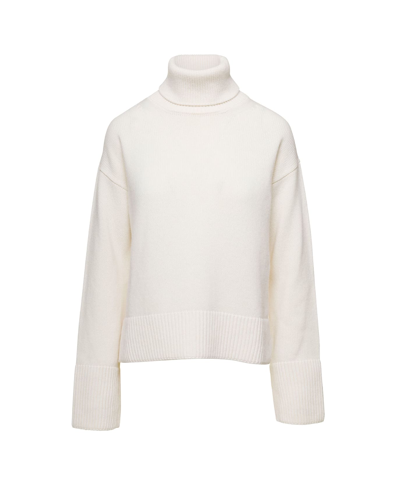 White Turtleneck Sweater With Ribbed Trim In Wool Woman