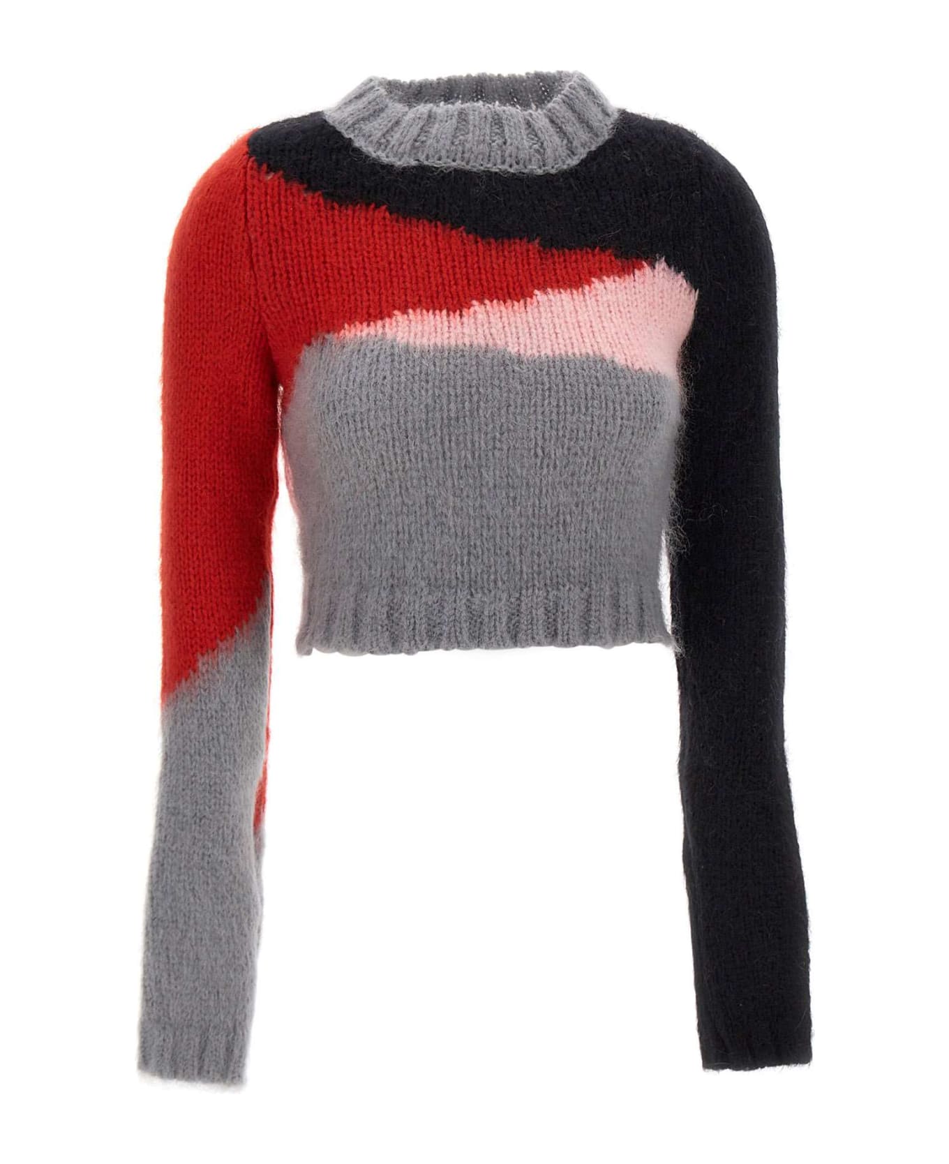 Philosophy di Lorenzo Serafini women's wool and mohair sweater, multicolor in shades of grey, black, red and pink, crew neck, cropped design, ribbed hems, tricot, ideal for autumn and winter. Made in Italy.