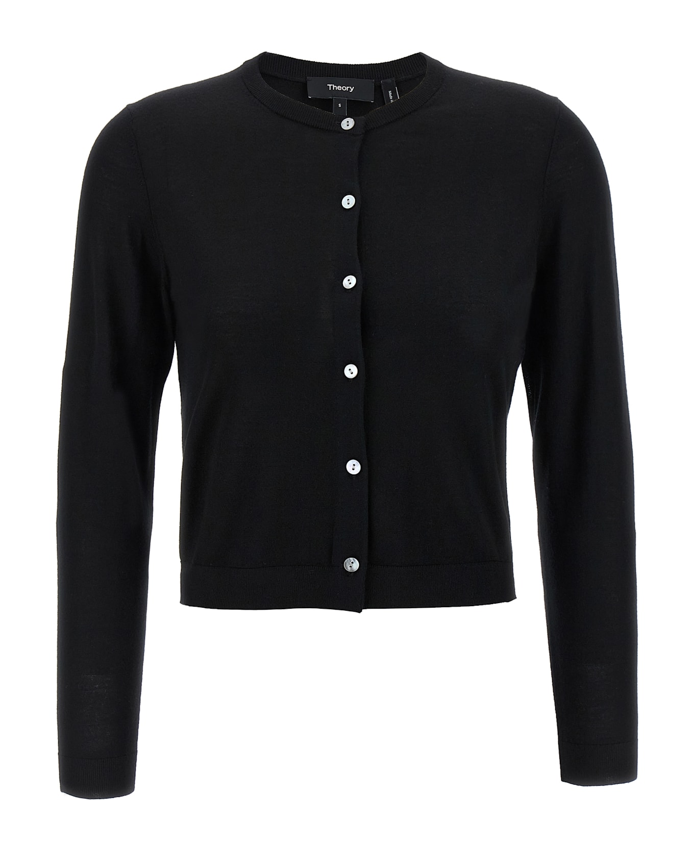 Merino wool cardigan, crop model, front button closure, crew neck, long cuffed sleeves.
