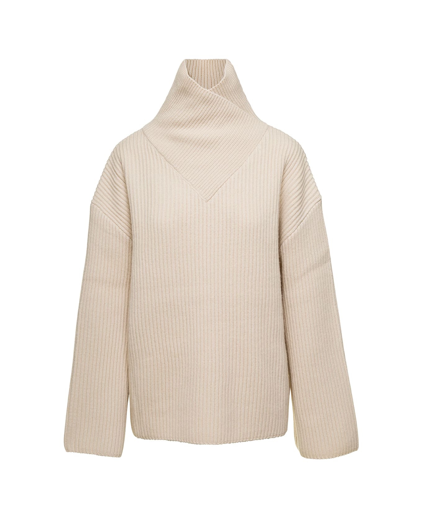 White Ribbed Sweater With Wrap Neck In Wool Woman