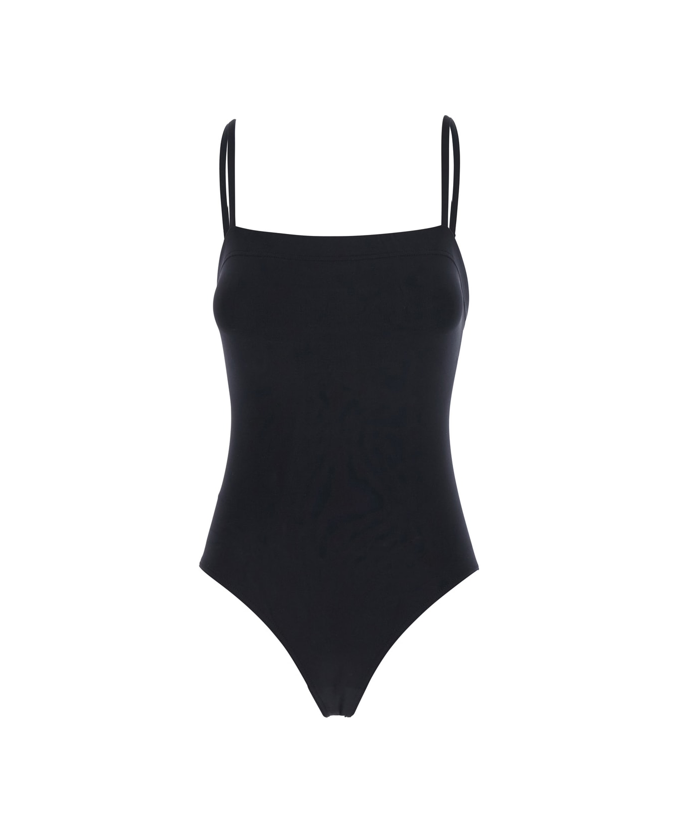 One-piece swimsuit Black Square neckline Thin straps Back neckline Tone-on-tone stitching Tech fabric Slim fit