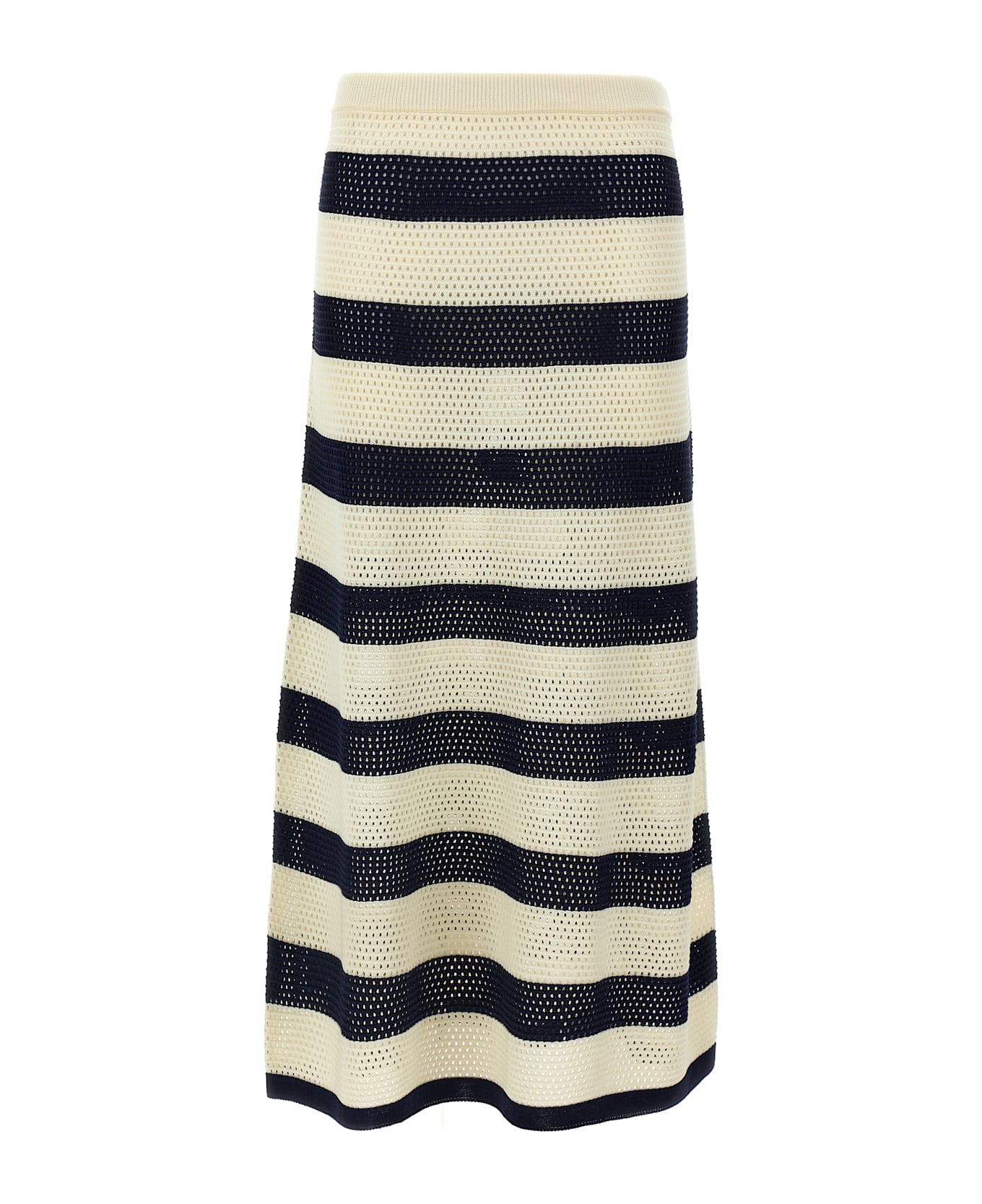 Longuette 'Bateau' flared skirt in cotton blend and perforated viscose with elastic waistband.
