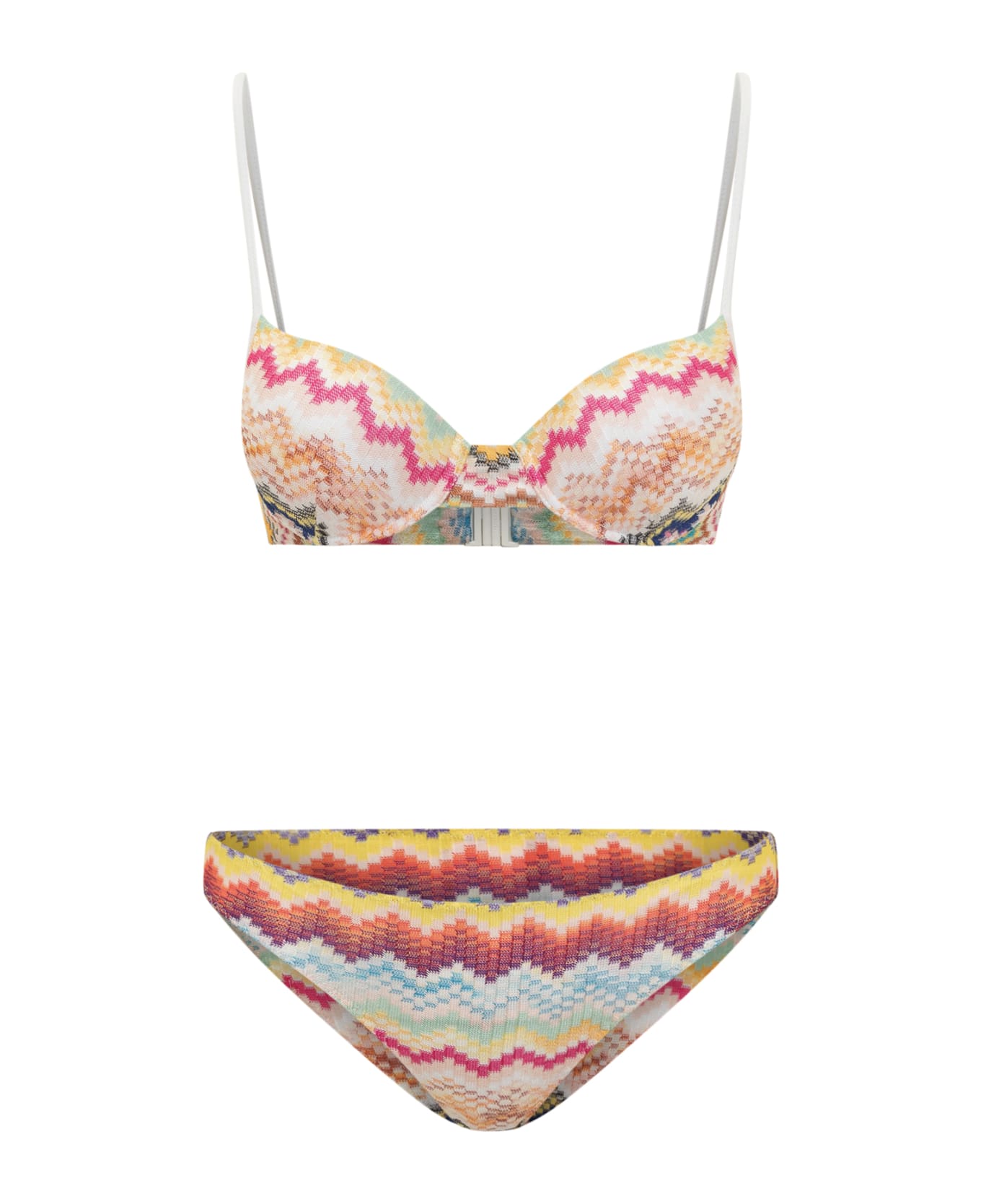 Two-piece bikini. Camisole top. Hook back closure. All-over multicolor pattern.
