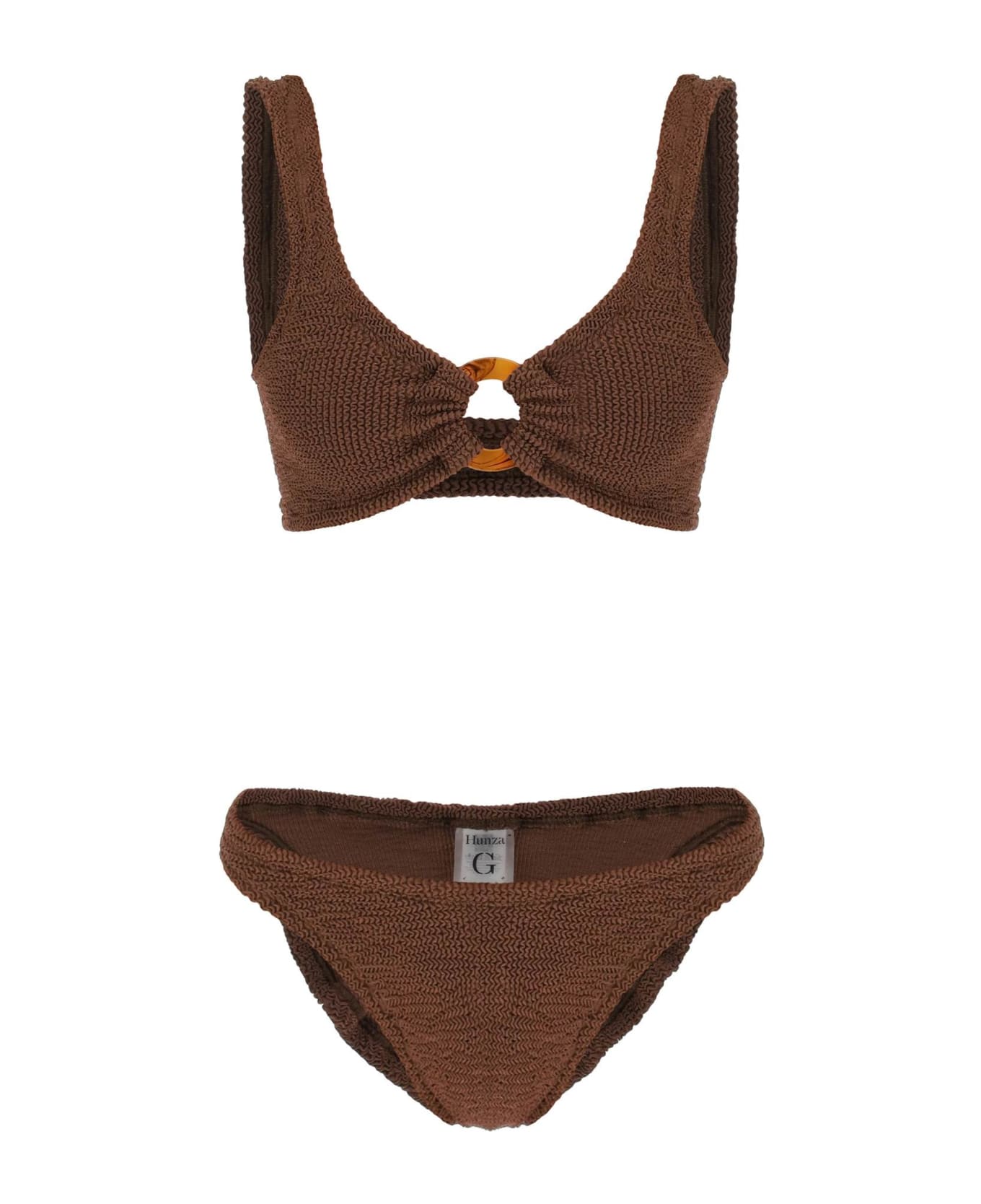 "Julia" bikini set from HUNZA G. Crafted from ruched stretch fabric and featuring a central ring top. One size.