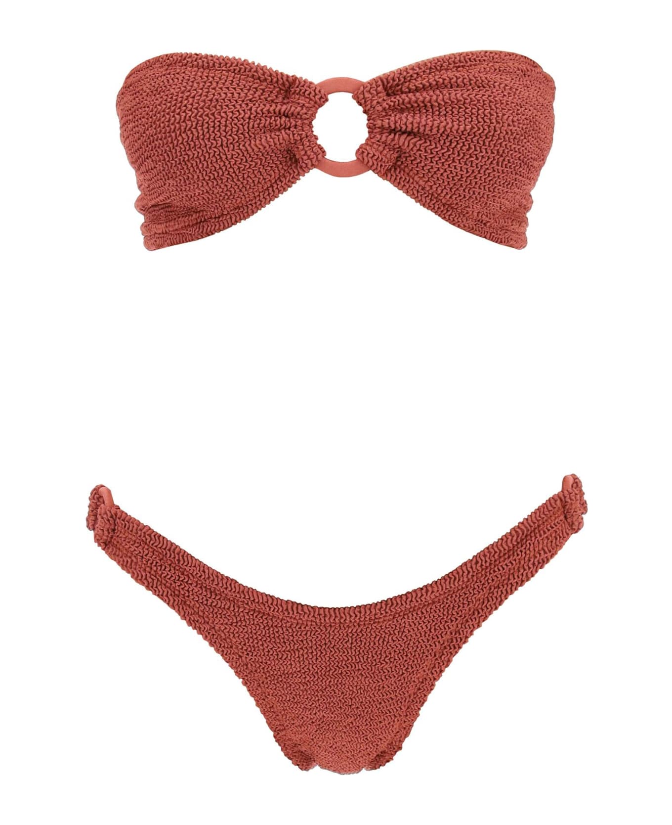 Hunza G bikini set crafted in elasticated smocked fabric, composed of a bandeau top with sweetheart neckline and high-rise briefs wearable also high-cut, enriched by decorative self-covered rings. One size.