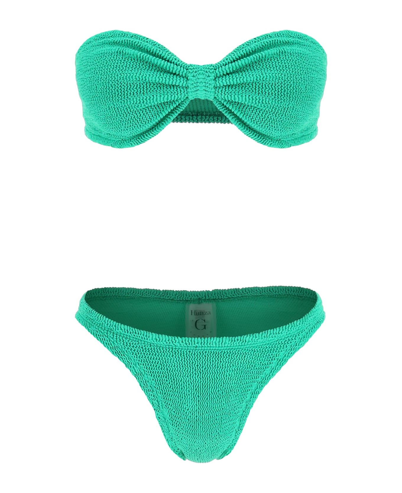 Jean bikini set by Hunza G crafted in crinkle stretch fabric. Bandeau top with front knot detail and regular briefs that can be worn with worn high or low rise. One size.