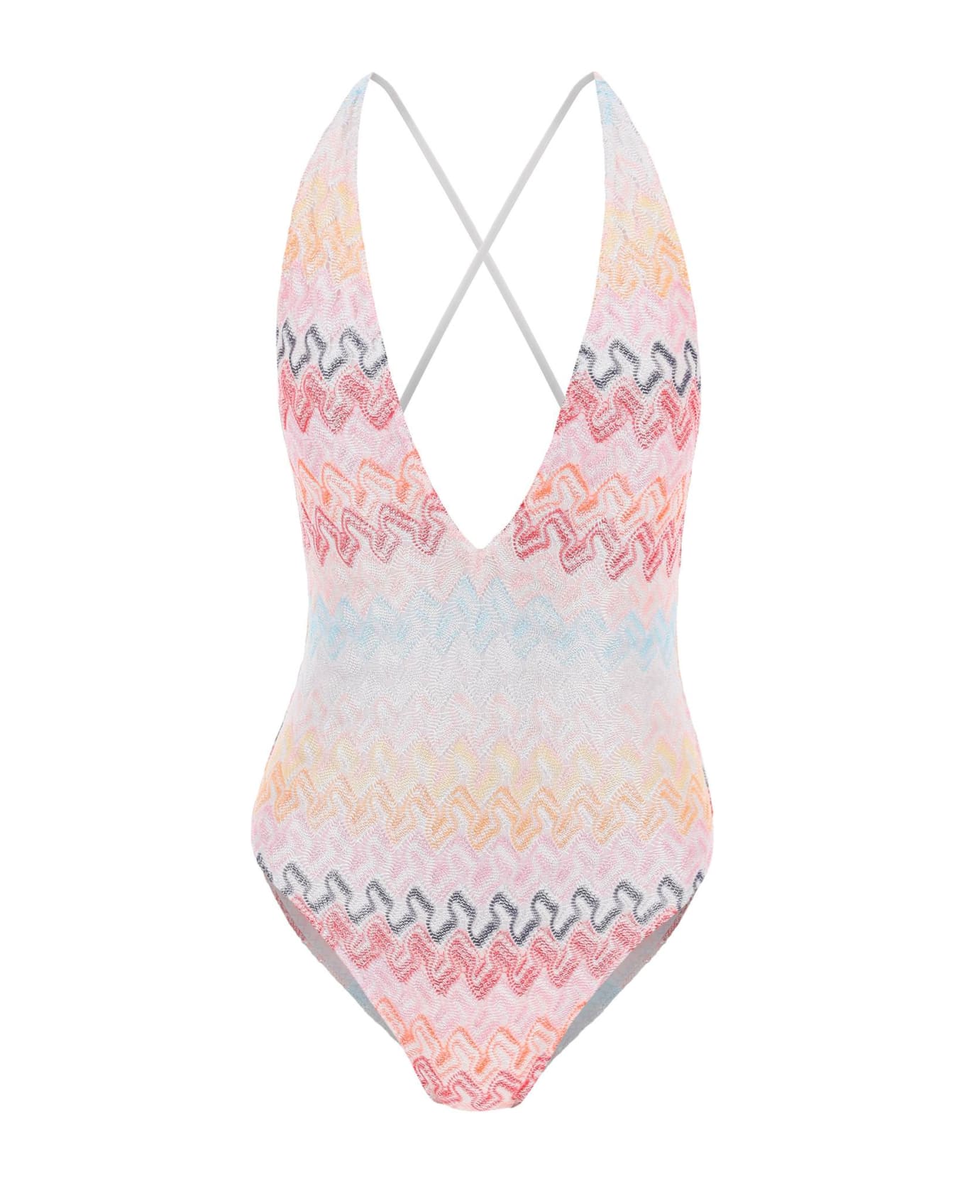 Missoni swimsuit crafted in stretch lightweight knit with multicoloured pattern. Deep V-shaped neckline, scooped back and thin straps with crossing on the back. Lined. The model is 177 tall and wears size 40 IT.