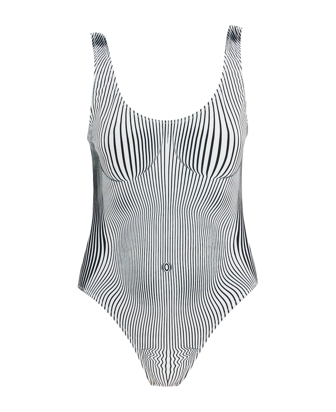 This Jean Paul Gaultier one-piece swimsuit is made of lycra with a Body Morphing print, featuring a square neckline and a wide open back. Unlined. The model is 177 cm tall and wears size S.