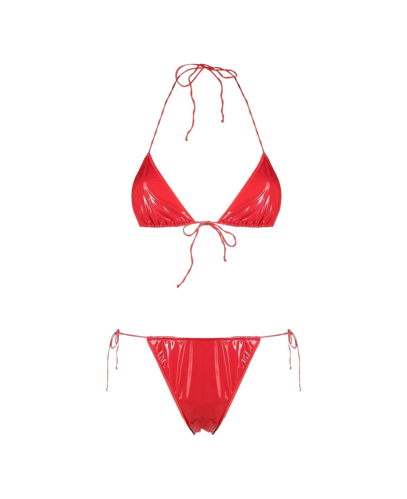 Oseree's red microkini made of latex and consisting of a low-cut bottom with side fastening and a triangle top without padding and with back fastening.