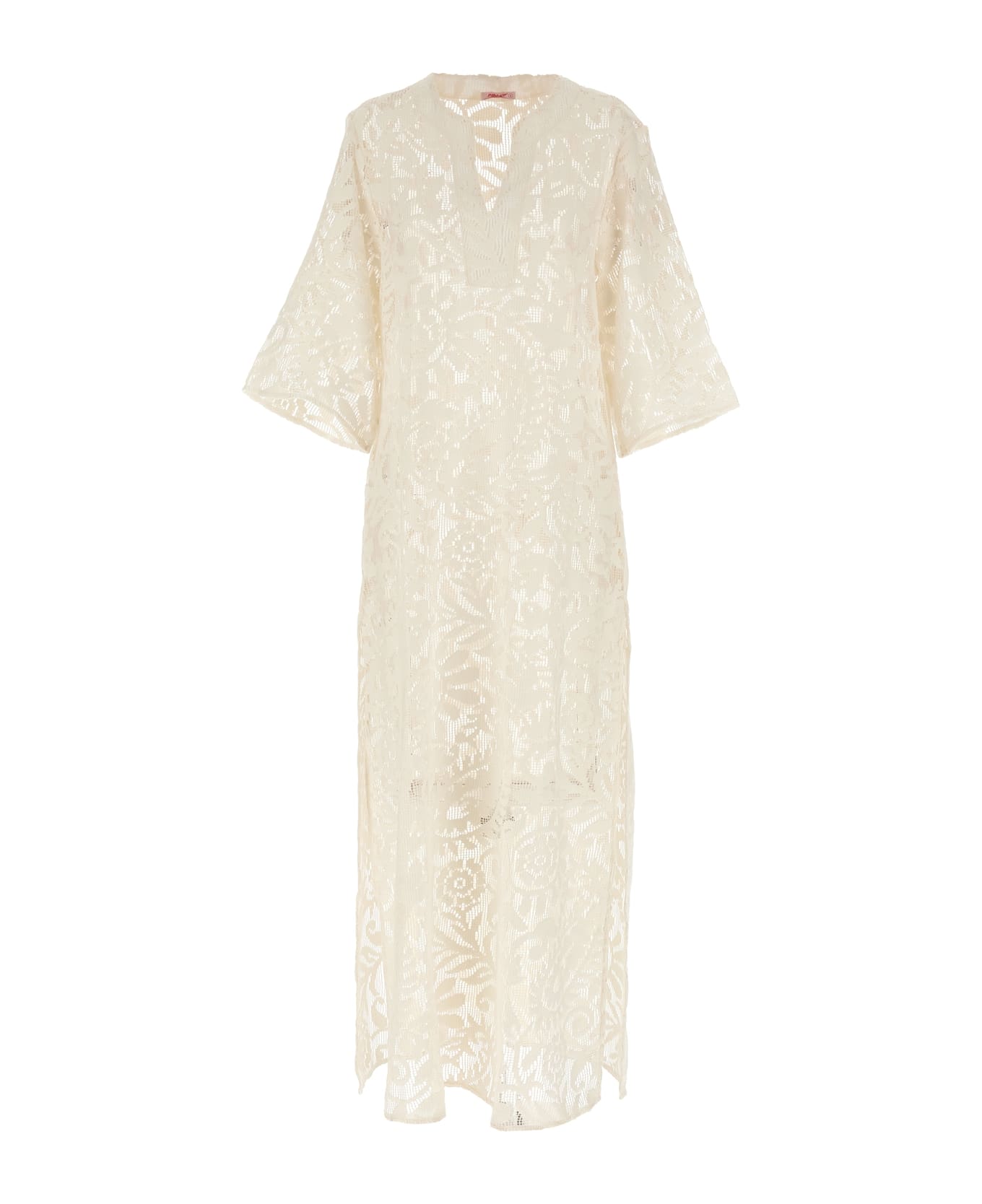 Long dress in macramé effect fabric I see I do not see, caftan model, V-neck, 3/4 sleeves, side slits.