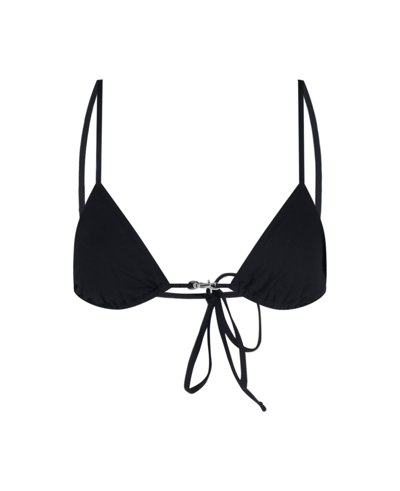 Gimaguas Carolina bikini top in black nylon with triangle design, thin adjustable straps, front hook, and back tie closure. Composition: 75% Polyamide, 25% Elastane