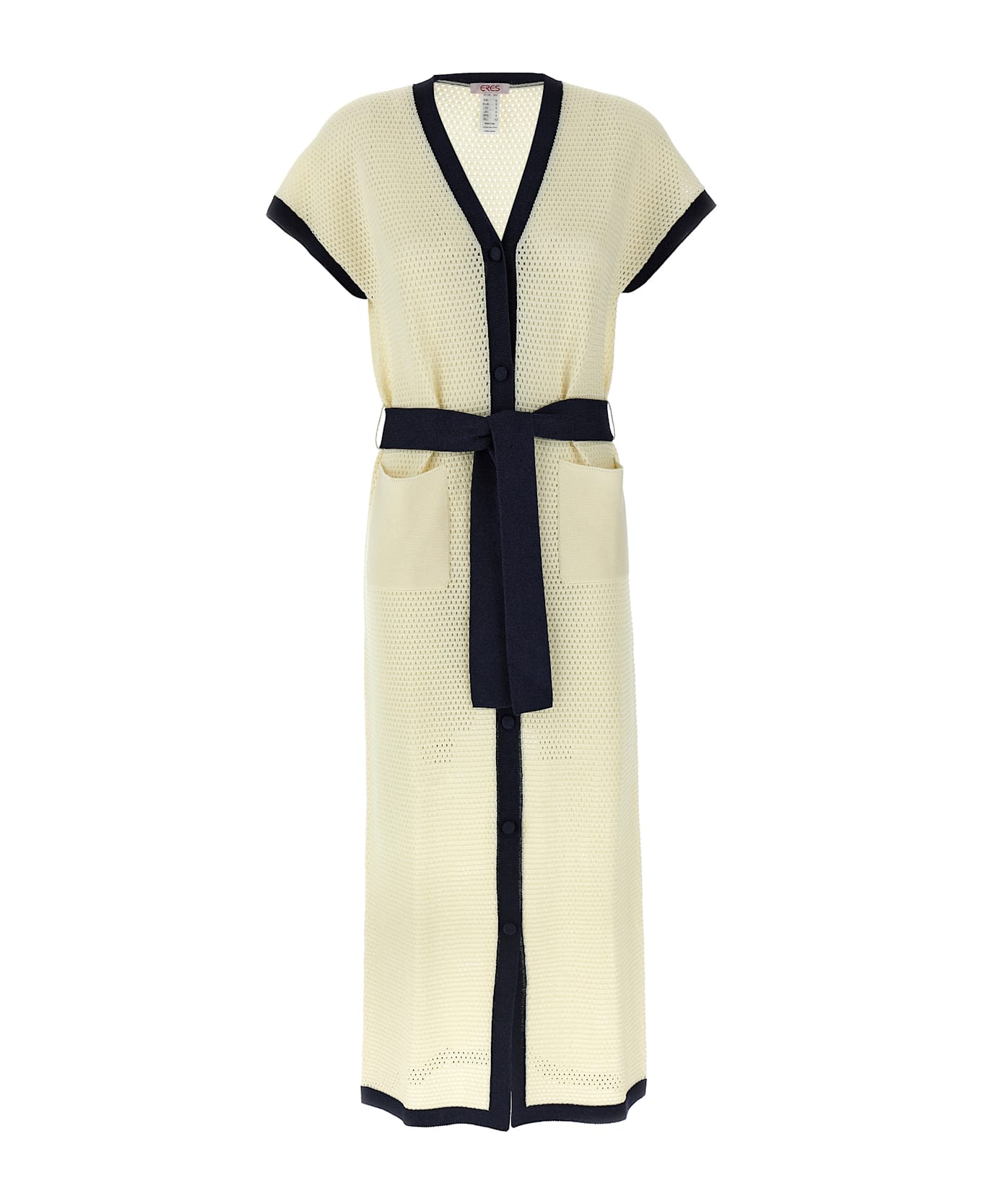 'Chavire' knit cotton blend and viscose openwork dress with contrast details, V-neck, front button closure, pockets, short sleeves, removable belt.