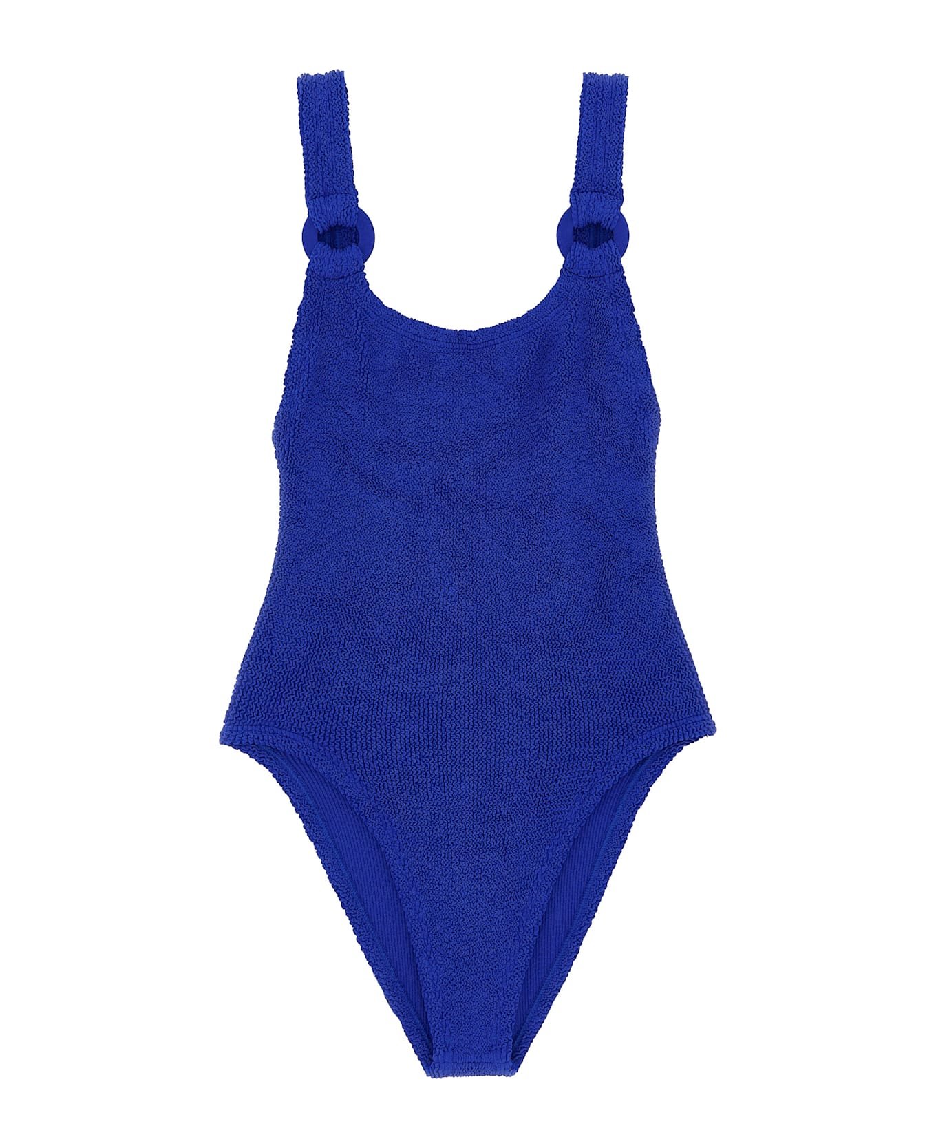The Original Crinkle fabric 'Domino Swim' one-piece swimsuit with wide round neckline at the back and front V-neck, cut-out tone-on-tone rim detail on shoulder straps, medium breast support, classic hem coverage.
