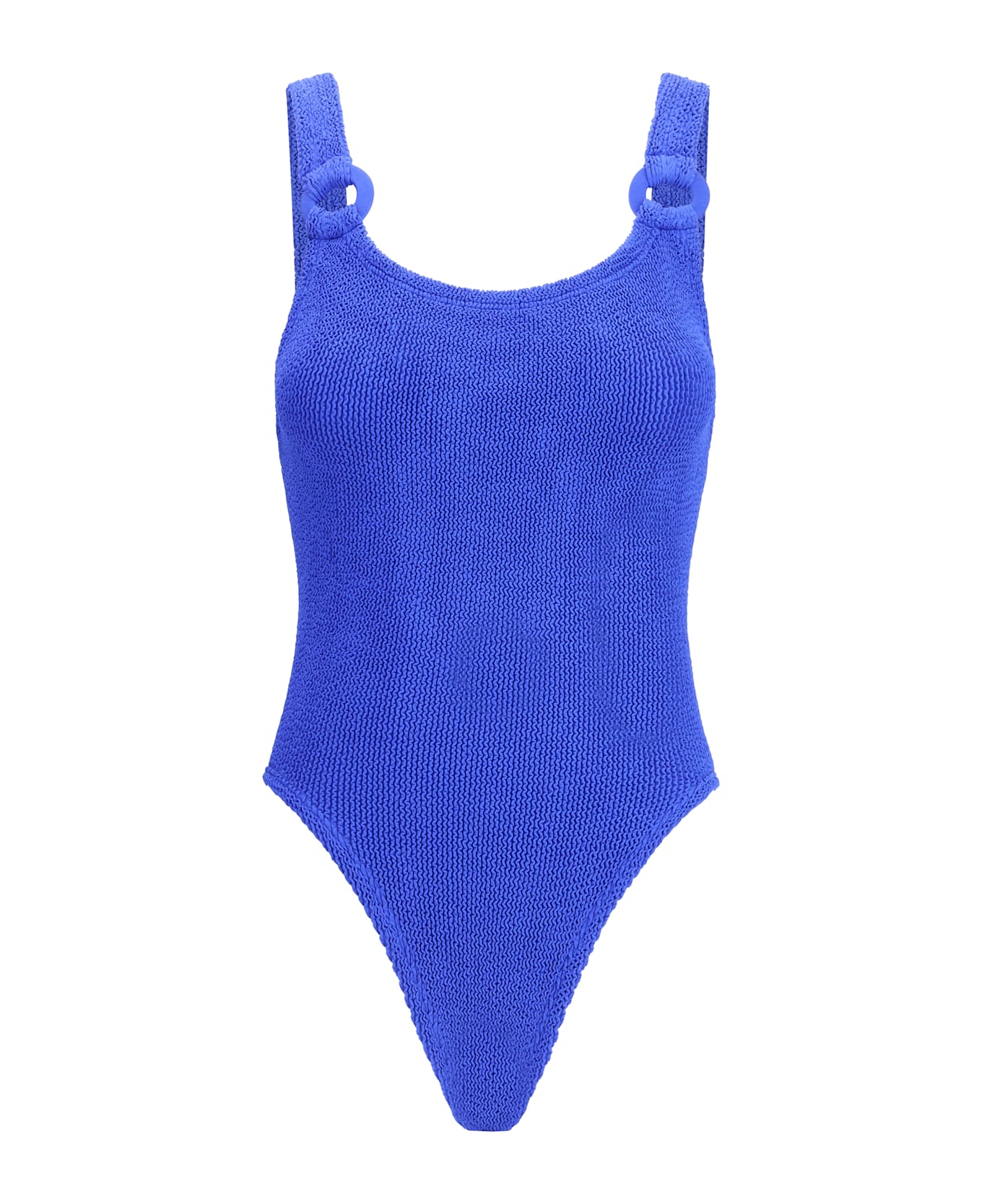 The domino one-piece swimsuit by hunza g combines elegance and comfort in a sporty and contemporary design. featuring a front neckline and tone-on-tone straps, it is enriched by a cut-out detail with a decorative ring that gives the garment a sophisticated and dynamic touch. made in the exclusive original crinkle fabric, the costume adapts perfectly to every body type thanks to its ability to stretch, sculpt and support the shapes, offering a unique and versatile fit.