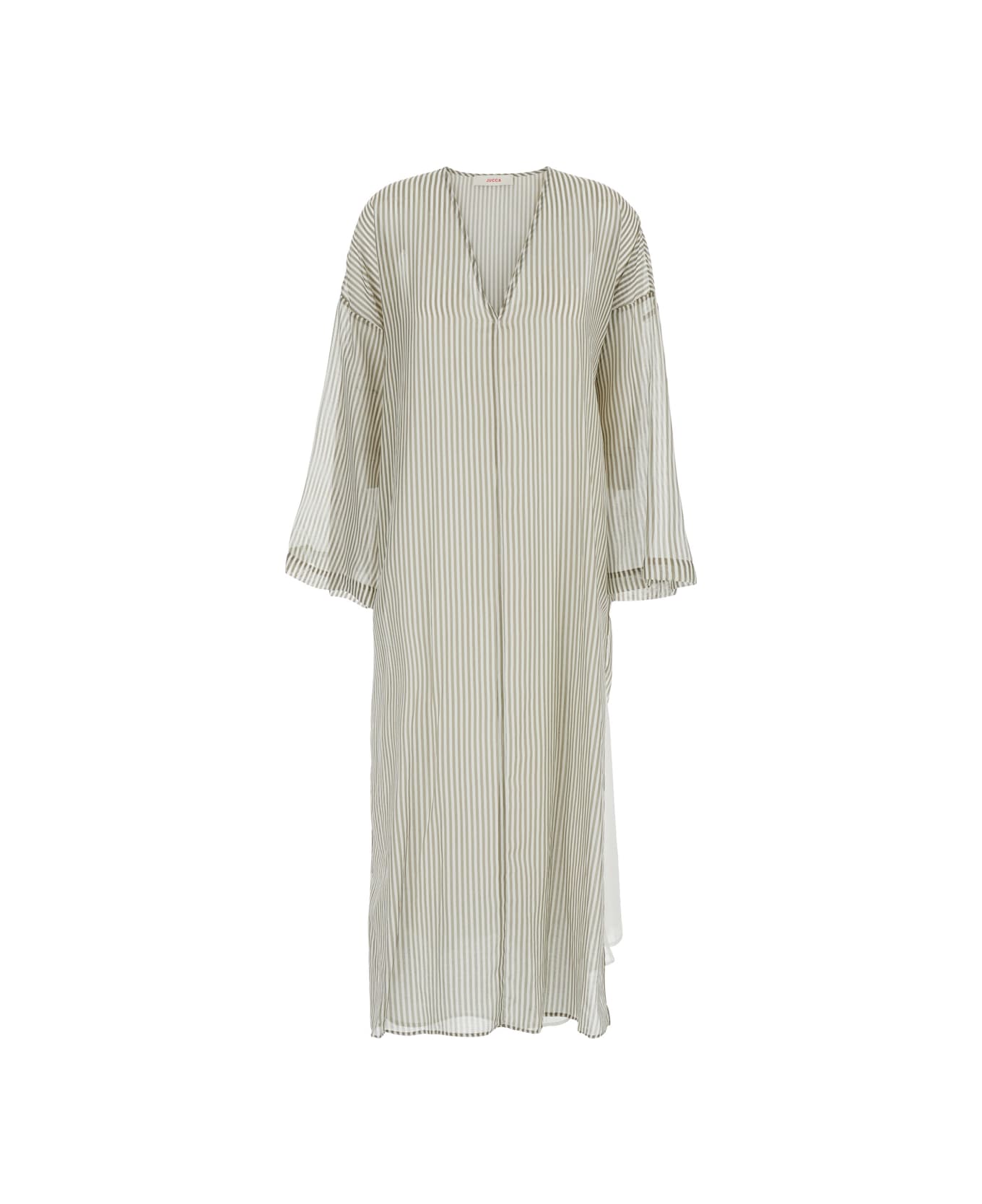 Green Caftan With V Neckline And All-over Striped Motif In Cotton And Silk Blend Woman