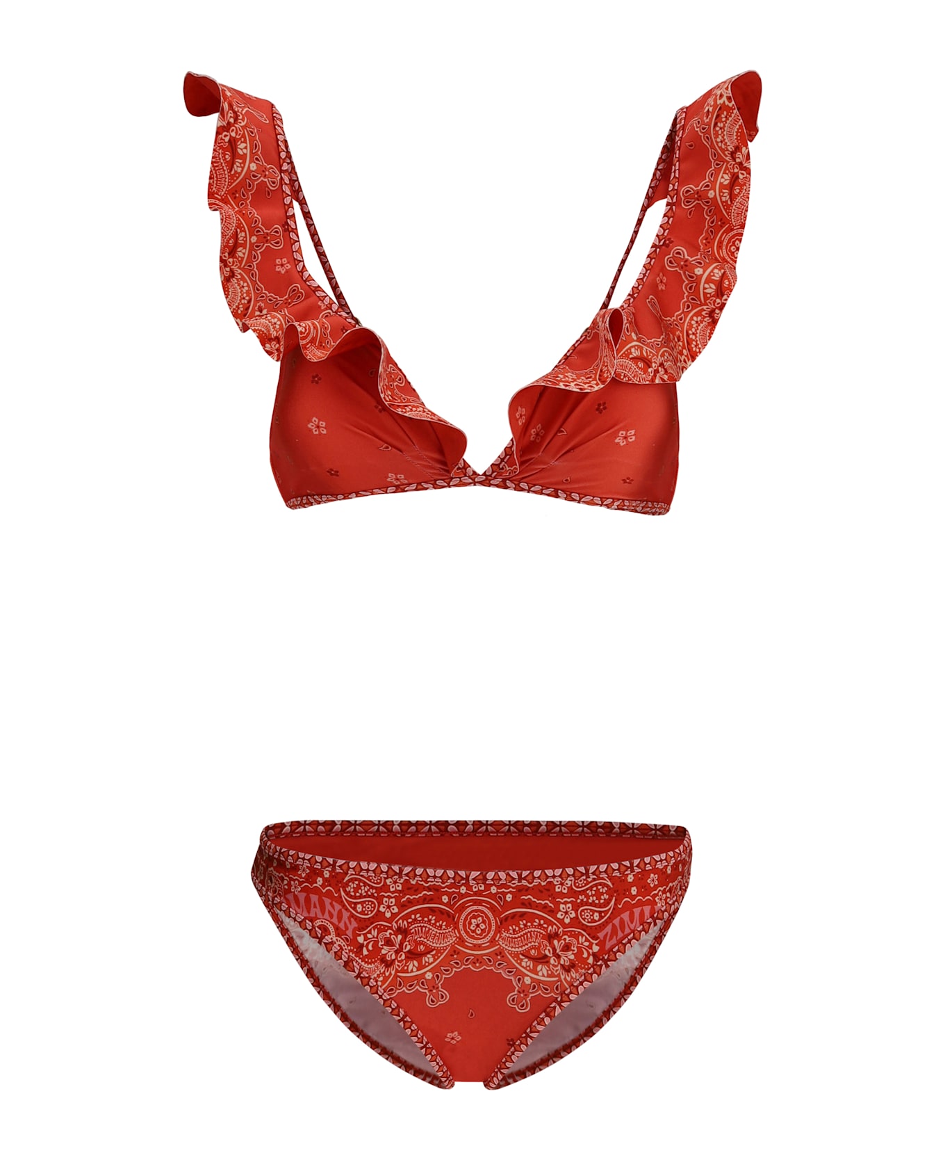 Zimmerman's lucky frill swimsuit is an item with bohemian and playful appeal, perfect for those seeking a unique and feminine look. the bold and colorful bandana pattern immediately catches the eye, while the hook-and-eye back closure offers a secure and comfortable fit. the ruffle-enriched straps add a touch of romance and movement, giving the swimsuit a lively yet delicate personality.