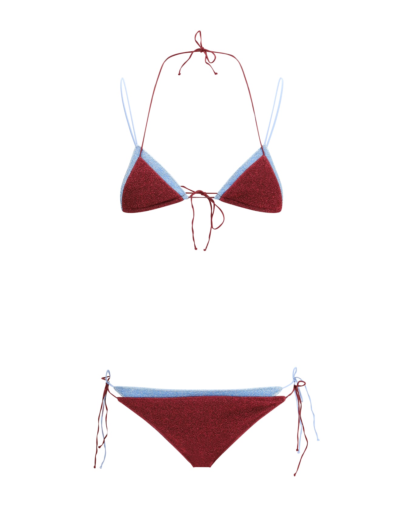 The lumiere bicolor swimsuit by oséree is a bikini that combines elegance and modernity with a refined design. the double-layer triangle top offers solid structure and optimal comfort, while the back closure with tie ribbons allows for an adjustable fit. the briefs, also with double layer and side ribbons, guarantee a customizable fit and are decorated with a circular metal plaque, which adds a touch of luxury and originality. the all-over bright glitter pattern makes this bikini extremely bright and chic, perfect for those looking for a look that captures attention with discretion but without sacrificing refinement.
