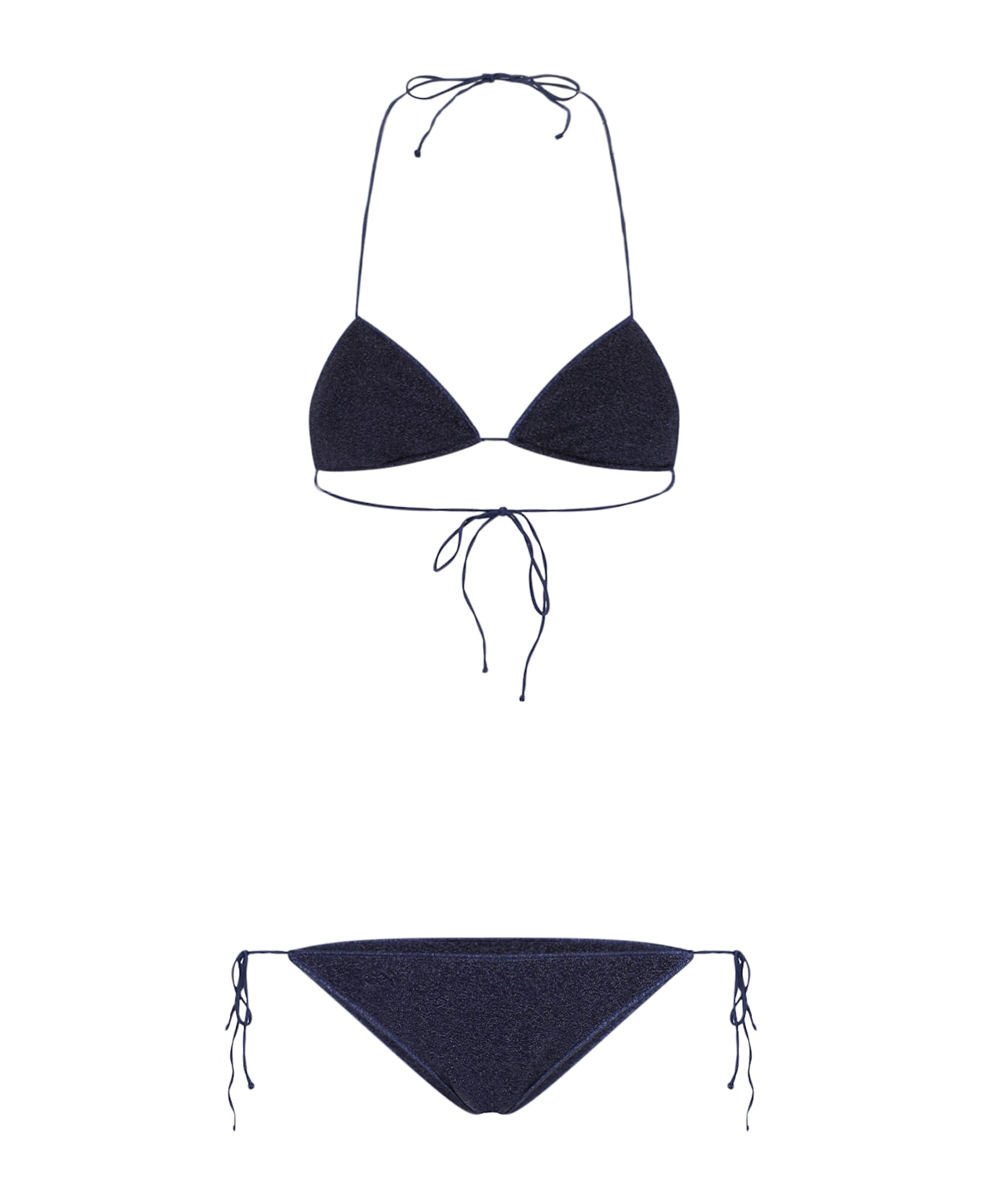 Oséree 'Lumière' bikini set in blue lurex with metallic details, bikini top, triangle design, thin straps, double laces at the back, bikini bottoms, high-cut design, side ties.