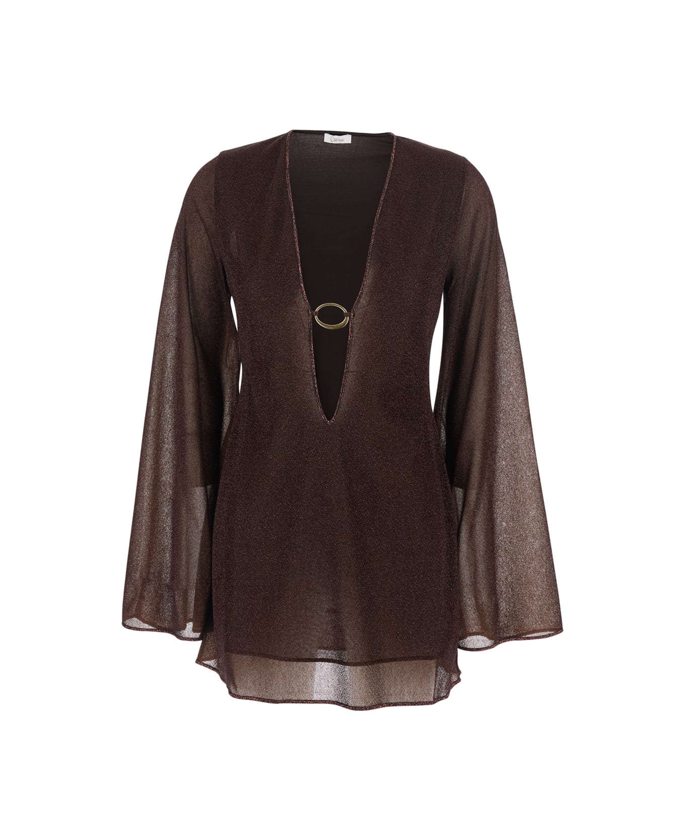 Caftan Brown Deep V-neck Long, wide sleeves Metal ring detail on the front Semi-sheer design Fabric Loose fit