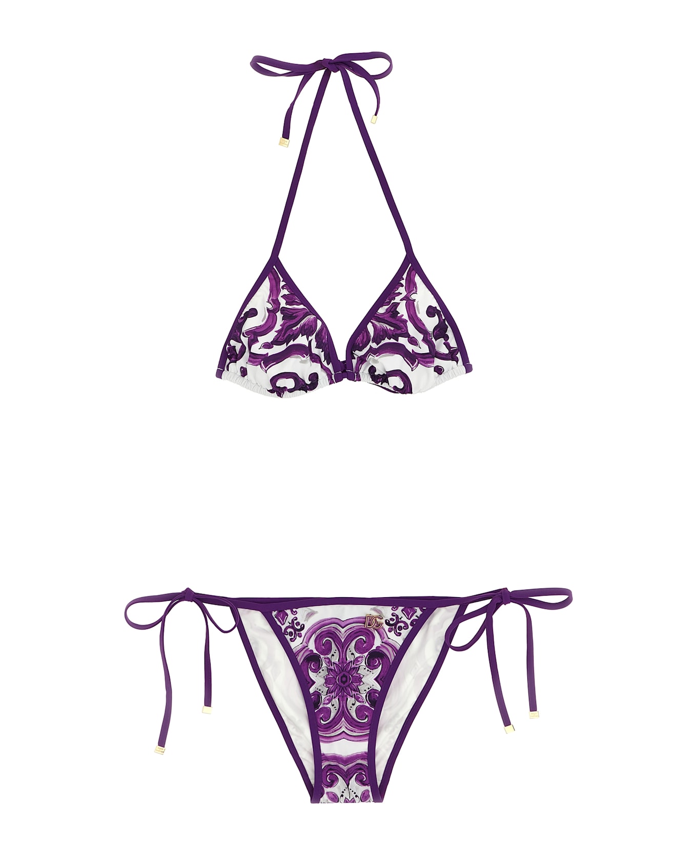 'Maiolica' print stretch fabric bikini consisting of triangle top with adjustable laces and mid-waist briefs with adjustable side laces and enameled metal logo on the front. The differences in print placement you might find on this product is a characteristic of Dolce&Gabbana's Handmade products. A peculiarity that makes each garment or accessory unique and exclusive. Composition: 76% polyester, 24% polyamide