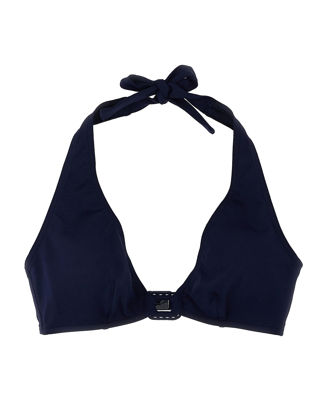Navire' triangle bikini top in Peau Douce* fabric with front pincers and side underwires, cups separated by decorative buckle, adjustable neck strap and back hook.