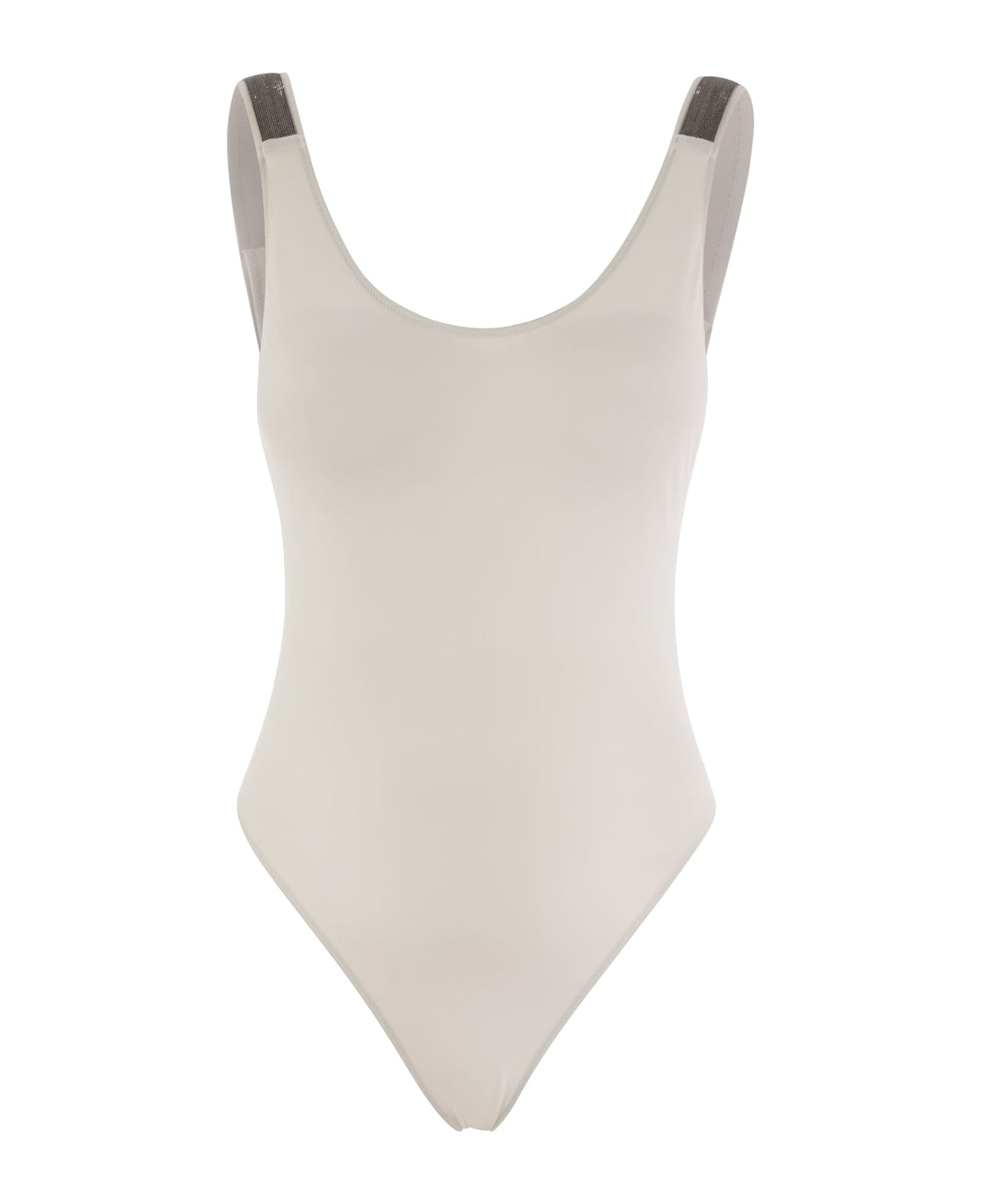The sporty taste of techno jersey is dressed with precious details in this essential and comfortable one-piece swimming costume. The minimal lines are enriched by the luminous reflections of the jewel embroidery on the straps, an iconic decoration of the Brunello Cucinelli collections, completing the model with a feminine touch. The techno jersey is a material composed of a synthetic fibre that contributes to making the texture comfortable to wear and quick-drying. - Nickel-free jewel decoration - U-shaped neckline DESIGNER ID: ML902VS699 C001