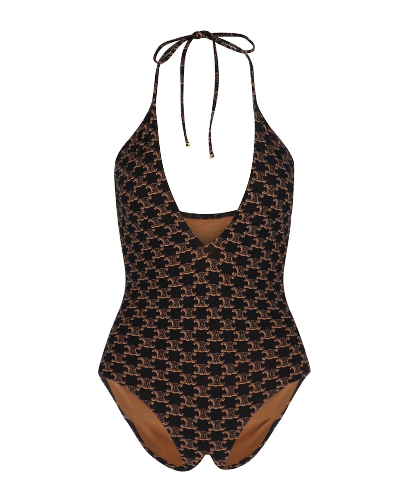 Celine Triomphe one-piece swimsuit in brown nylon with logo print pattern, V-neck, thin straps, lace closure at the back, plunge neckline at the back, and high-cut design. Composition: 62% Polyamide, 38% Elastane