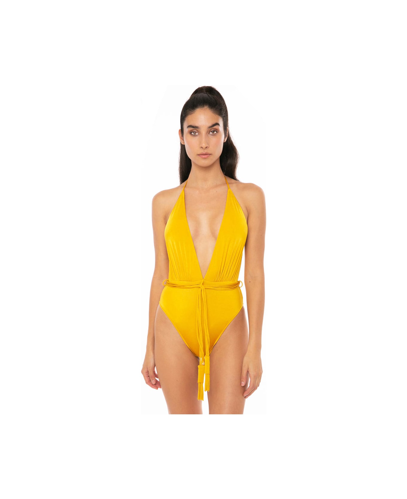 One piece woman swimsuit, shiny mustard color,deep V neck, waist belt, composition: 90% Polyamide 10% Elastane