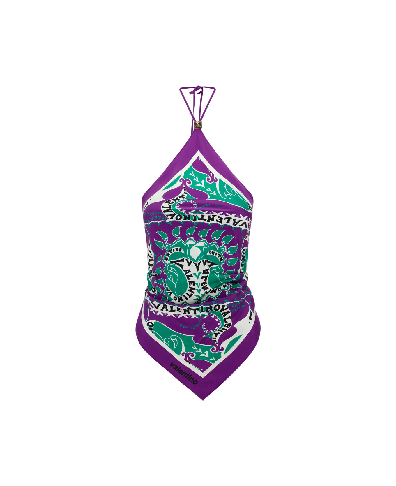 Silk pattern top by valentino pap, halter neckline front with lace-up back, multicolored design with all-over repeating prints, contrasting iconic brand monogram, asymmetrical hem, slim fit. Composition: 100% % Silk
