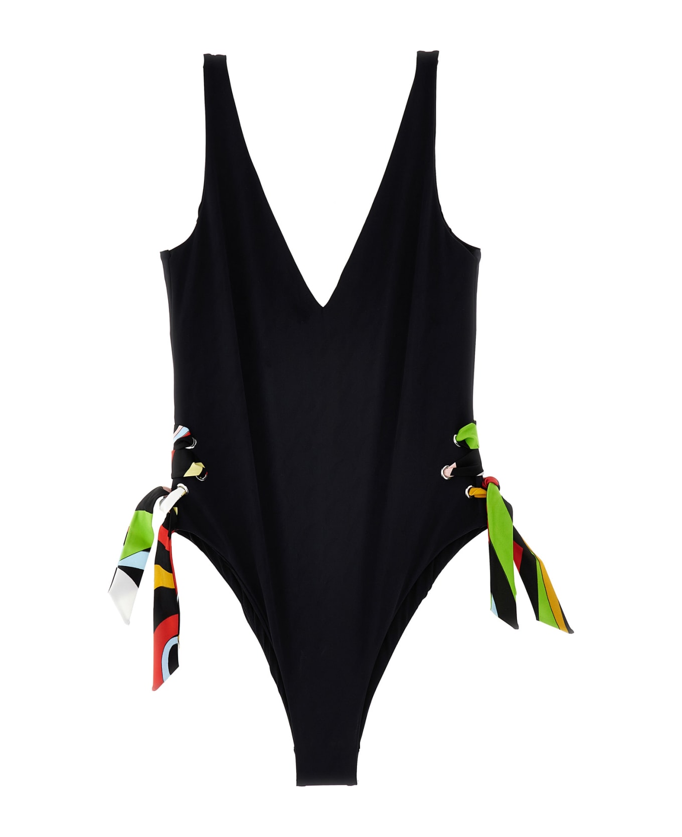 Stretch fabric one-piece swimsuit with lacing on the sides and a V-neck. Composition: 90% viscose 6% polyamide 4% elastane
