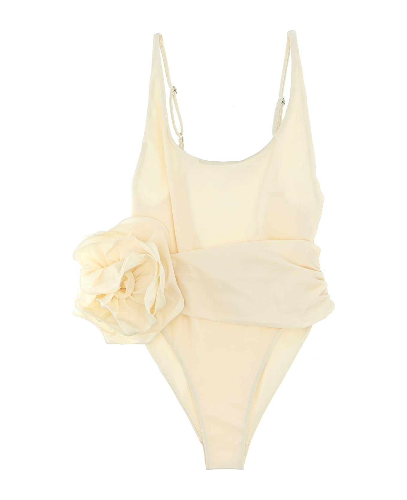 'Swimsuit 03' stretch fabric one-piece swimsuit with adjustable thin straps, back neckline, fixed belt detail at the waist with curl and maxi flower. Composition: 75% polyamide, 25% elastane