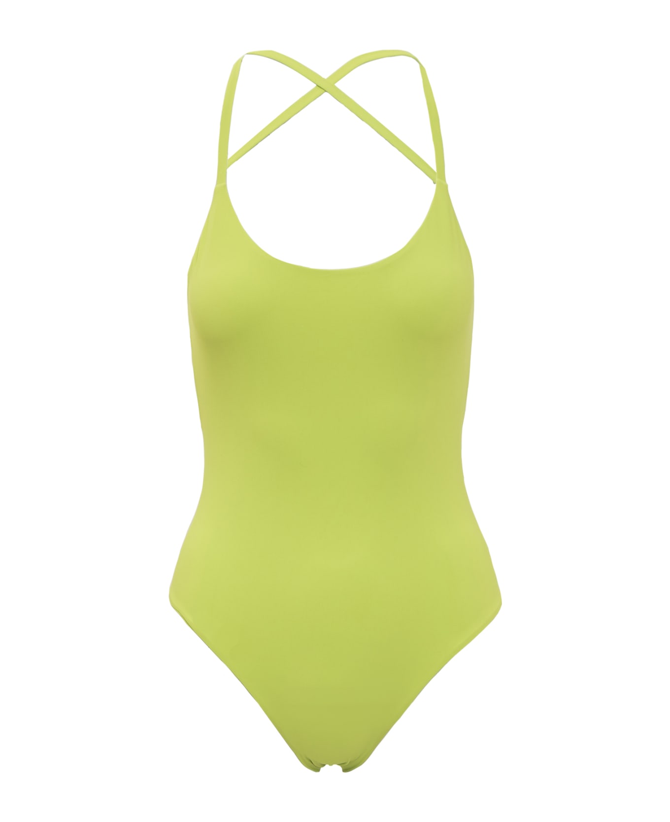 One-piece swimsuit. U-neck on the front. Crossed straps on the back. Stretch fit.