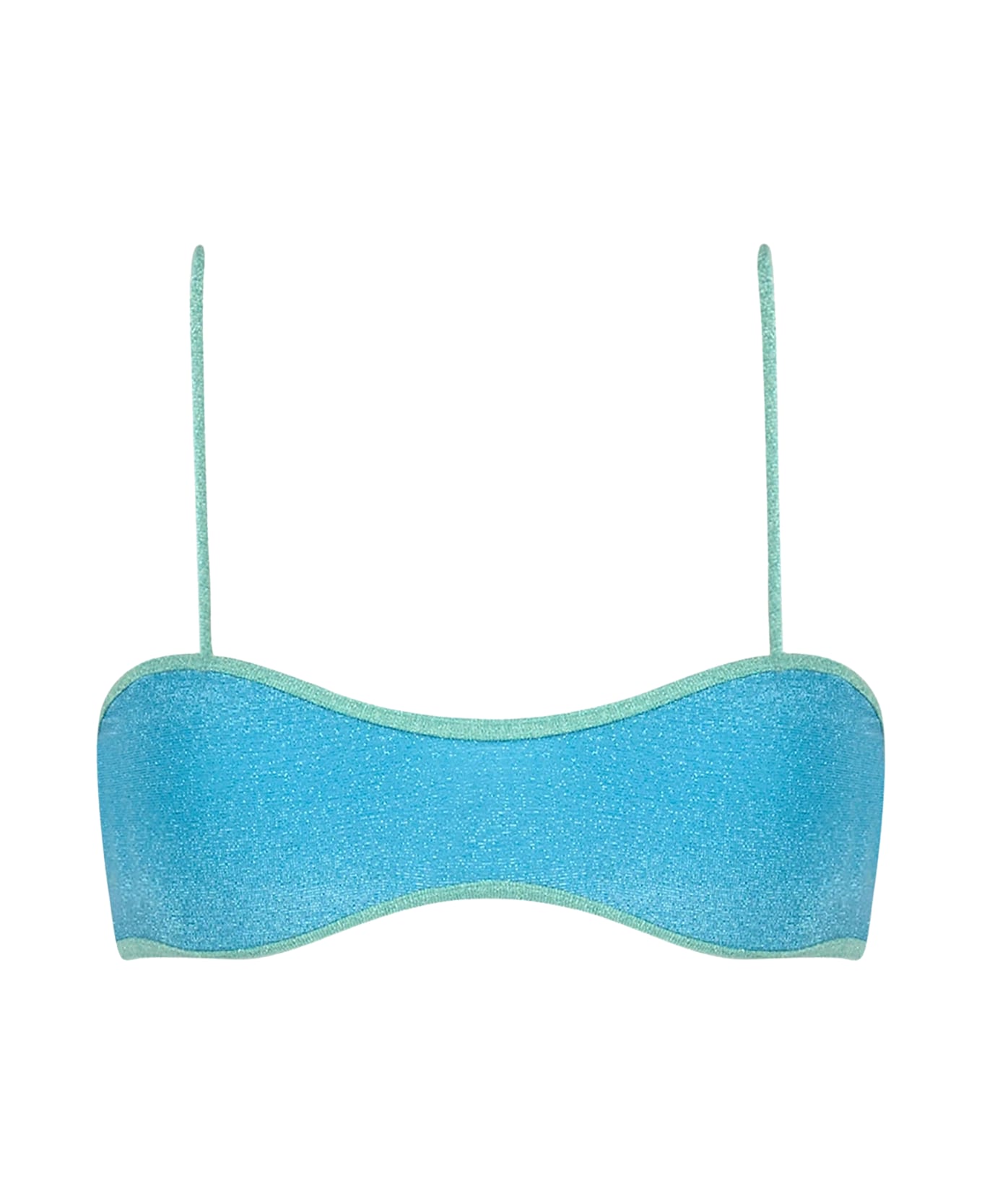 The Laryn bralette has you (un)covered with barely-there spaghetti straps: a textured scoop crop bikini top in lurex with contrast piping. Your ultimate companion for relaxing by the beach or poolside. Low bralette top swimsuit with thin straps Closed on the back No cups Turquoise lurex fabric Water green piping Composition: 64% viscose 17% polyester 15% polyamide 4% elastane Lining: 90% polyamide 10% elastane Model is 176 cm and wears a size S