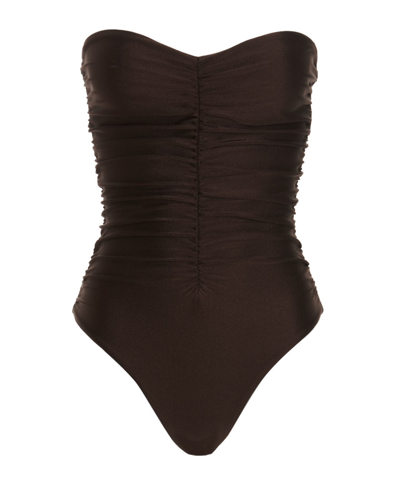 Yara one-piece, strapless swimsuit crafted in a metallic effect fabric and featuring a crinkled front.