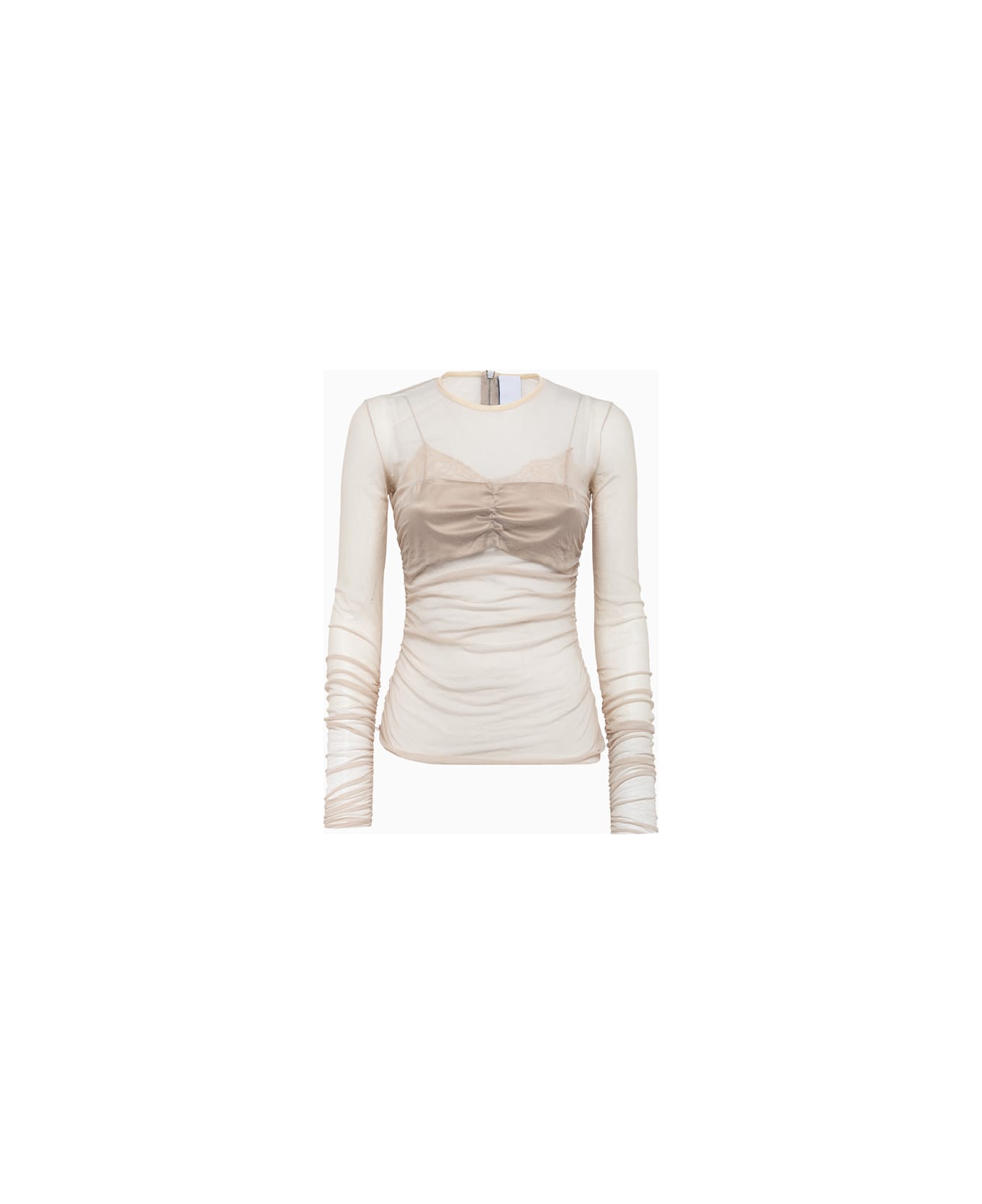 made in italy solid color tulle top. round neckline. visible zip closure at back. long sleeves. draped hem and back. slim fit. composition: 100% polyester.