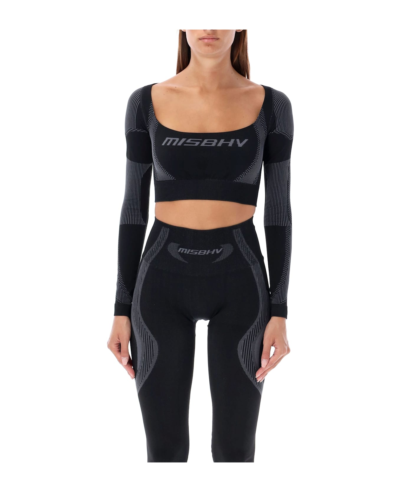 Active Crop Top By Misbhv. Featuring: Scoop Neck Long Sleeves Logo At Front Decorative Bands Elasticised Cuffs And Hem Slim Stretch Fit Model Is 1,72 M And Wears Size Xs/s