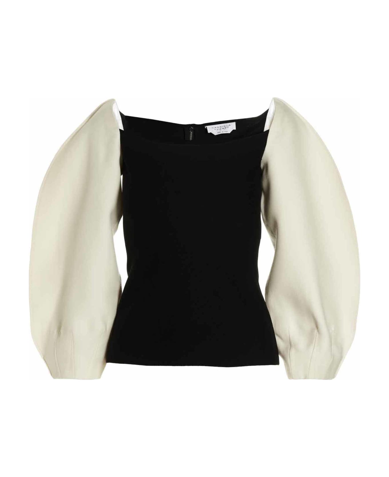 Ayers' wool and silk top with knit bodies and wide fabric sleeves, contrast color and a zip closure at the back.