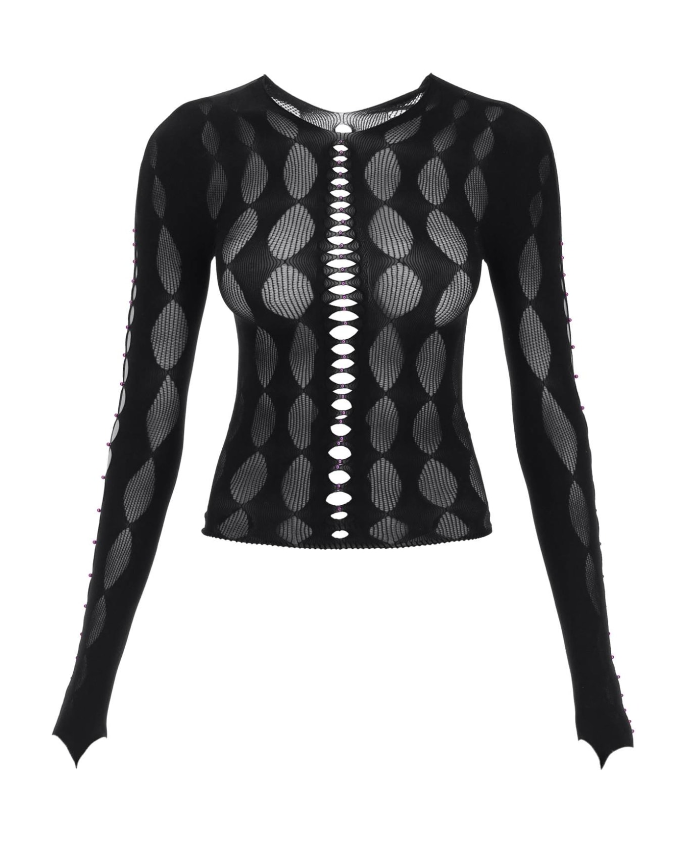 Fitted crew-neck top by Rui made of semi-sheer stretch knit, embellished with see-through detailing all over and cut-outs finished with contrasting beads. Long sleeves with thumbhole cuffs. The model is 177 cm tall and wears a size 2.