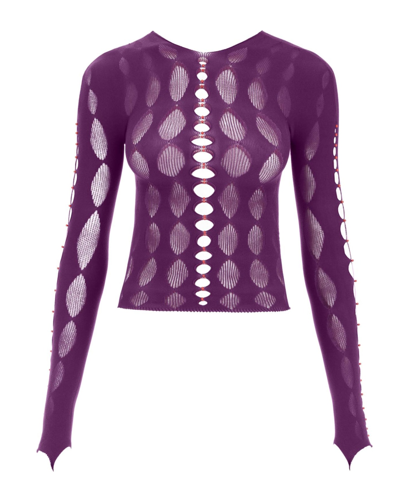 Fitted crew-neck top by Rui made of semi-sheer stretch knit, embellished with see-through detailing all over and cut-outs finished with contrasting beads. Long sleeves with thumbhole cuffs. The model is 177 cm tall and wears a size 2.