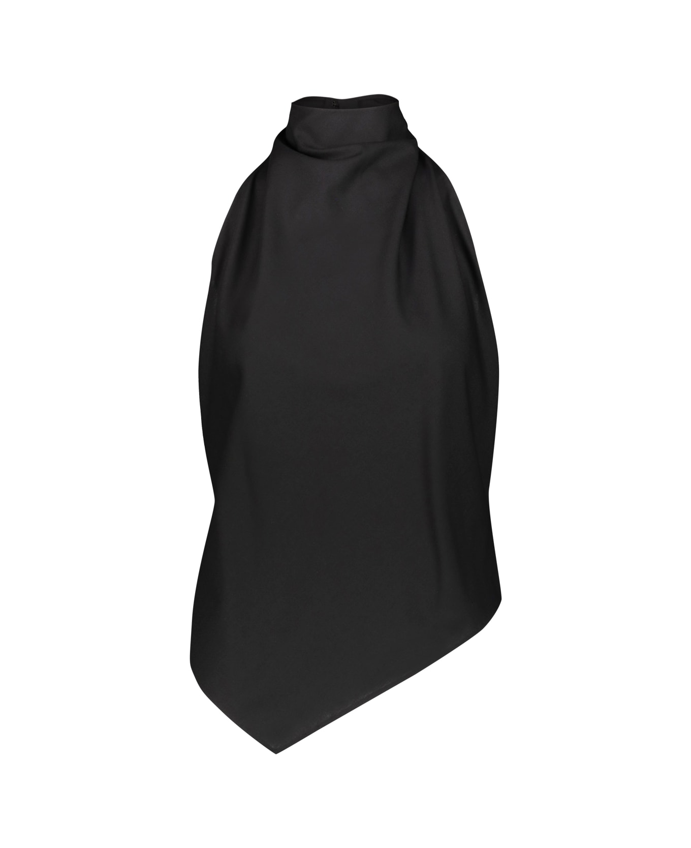 The Row Bence top in Merino wool, high neck, open Back, asymmetrical draped hem.