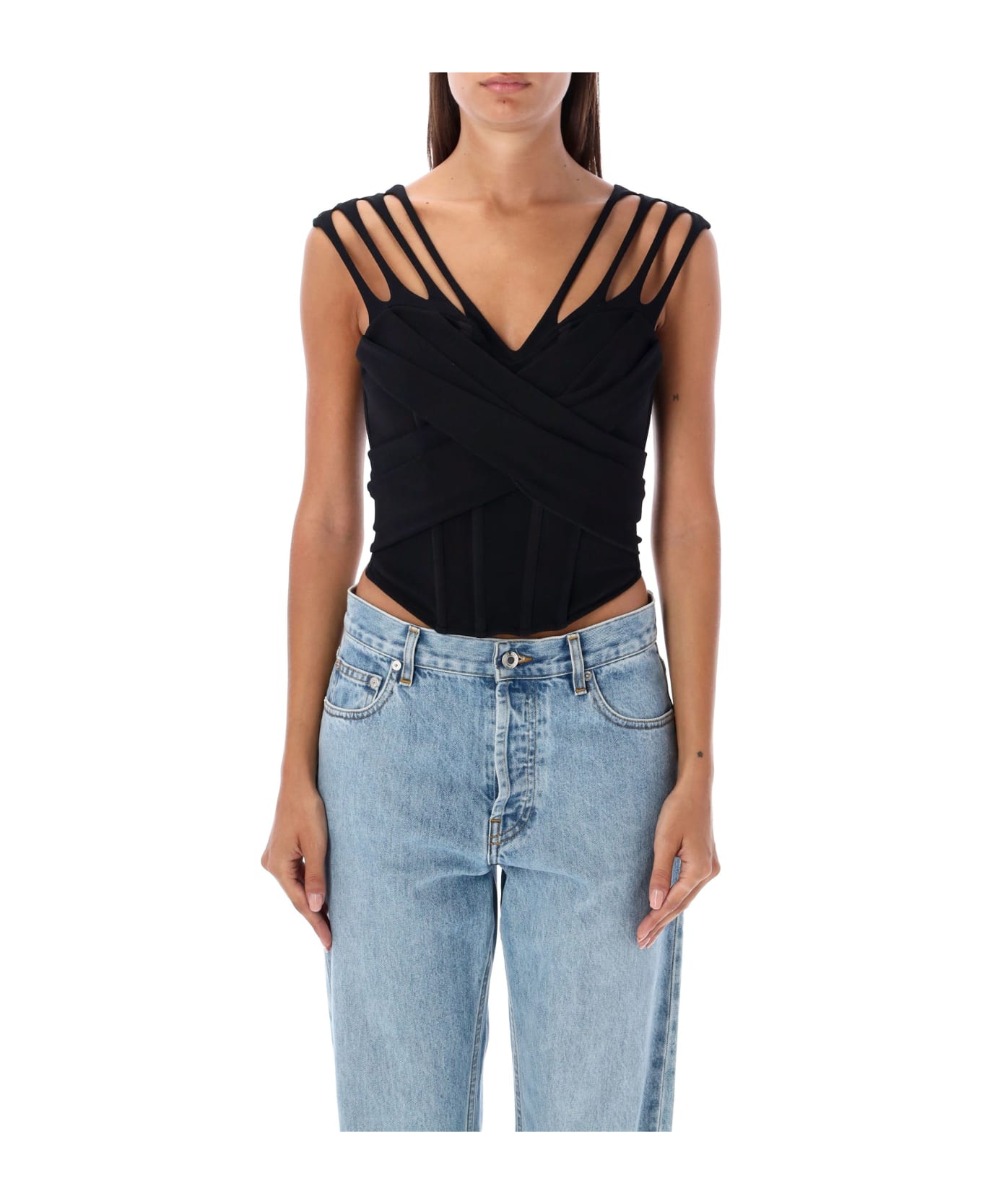 Bianca Bra By Misbhv. Featuring: V-neck Sleeveless Cut Outs On Shoulder Straps Fabric Crossing At Front Pleats Rear Zip Closure Asymmetric Hem Model Is 1,72 M Tall And She Is Wearing Size S