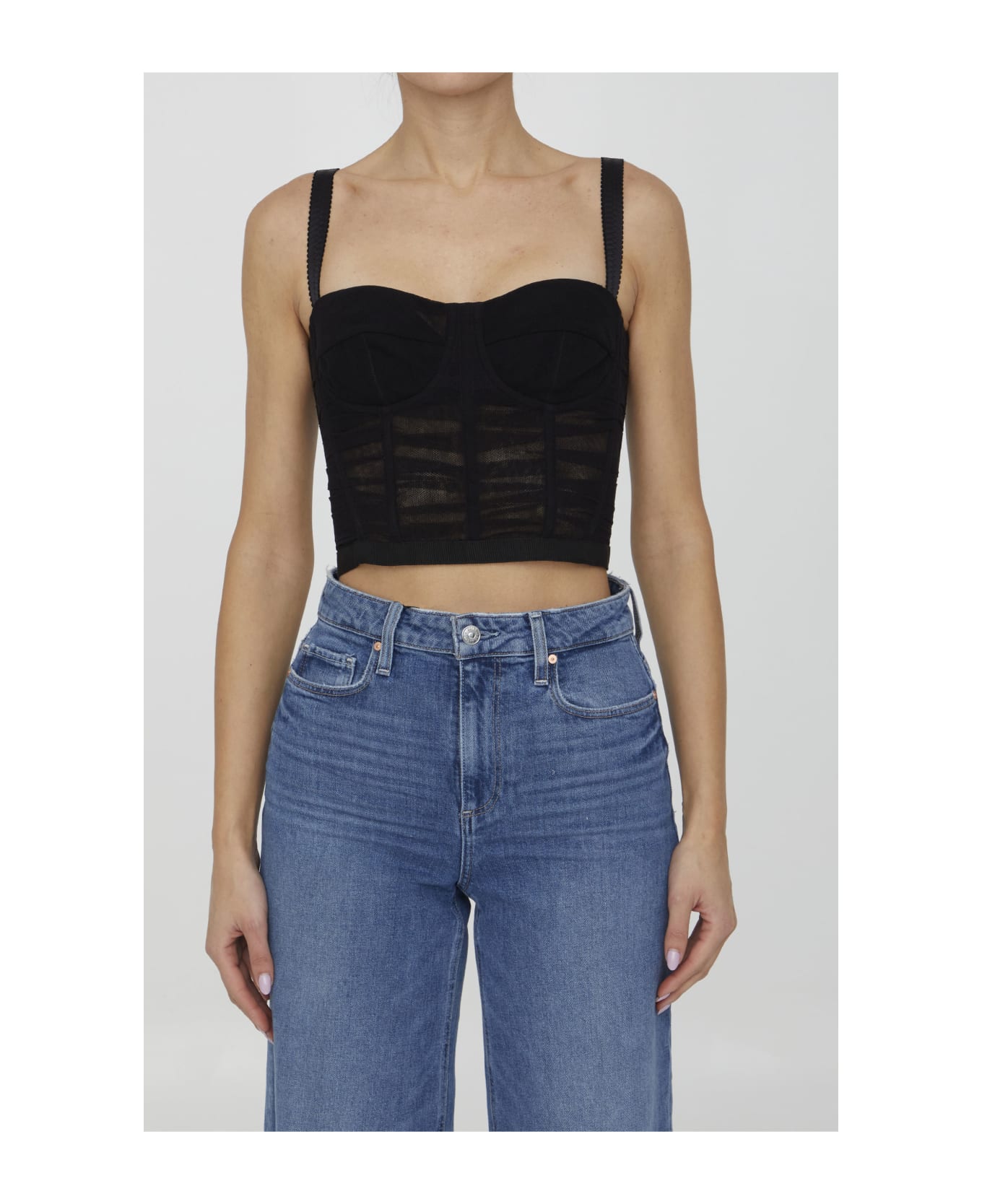 Cropped bustier top in black cotton and silk blend. It features adjustable thin straps, sweetheart neckline and rear zip closure. The model is 180cm tall and wears size 40.