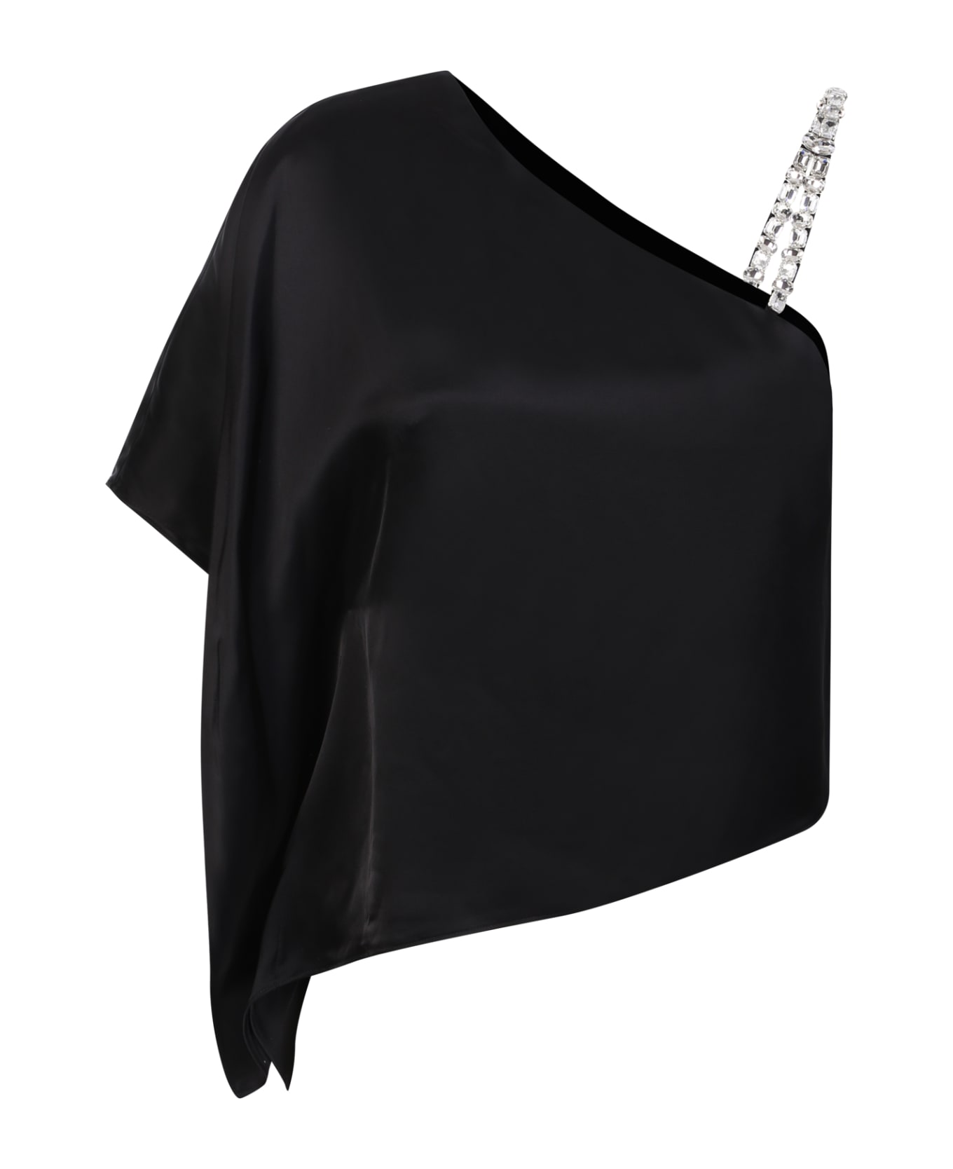 Deep neckline. One-shoulder.  Shoulder strap with crystals. Draped design. Color: black