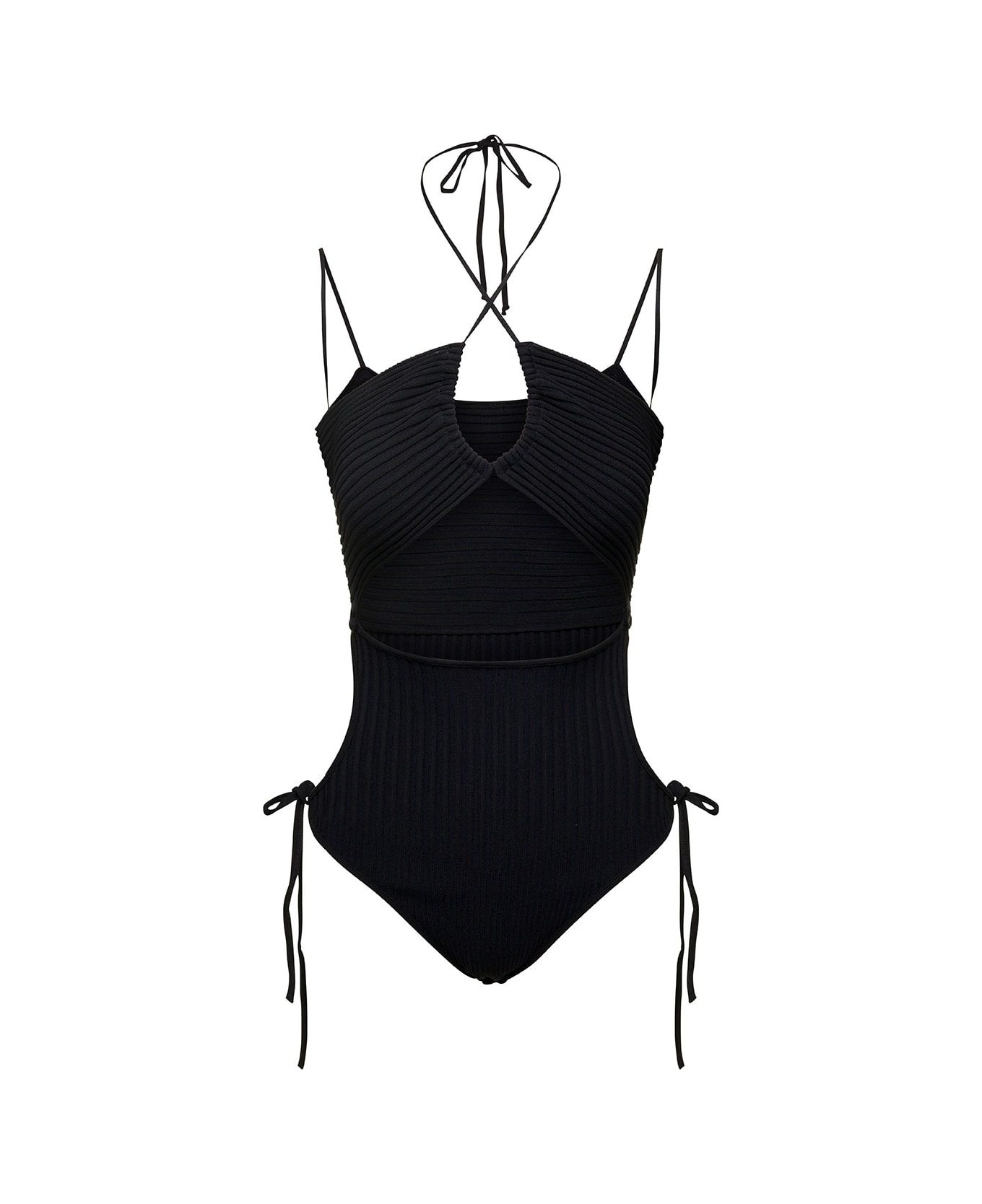 Black Ribbed Body-suit With Cut-out Detail And Halterneck In Viscose Blend Woman