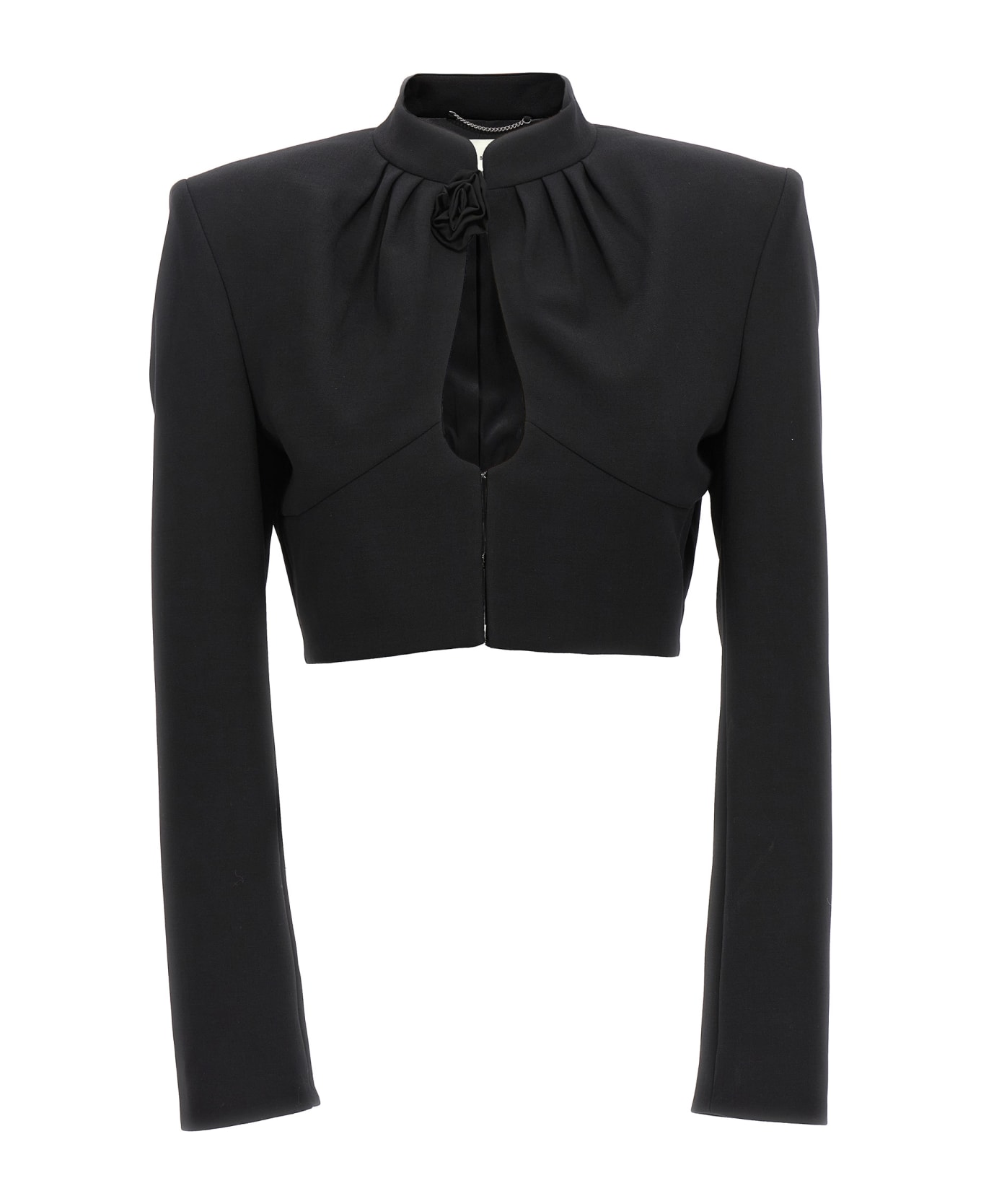 '05' short jacket in stretch wool with V-neck, floral appliqué at the neck, padded shoulder straps, long sleeves, and front hook closure. Composition: 96% virgin wool 4% elastane