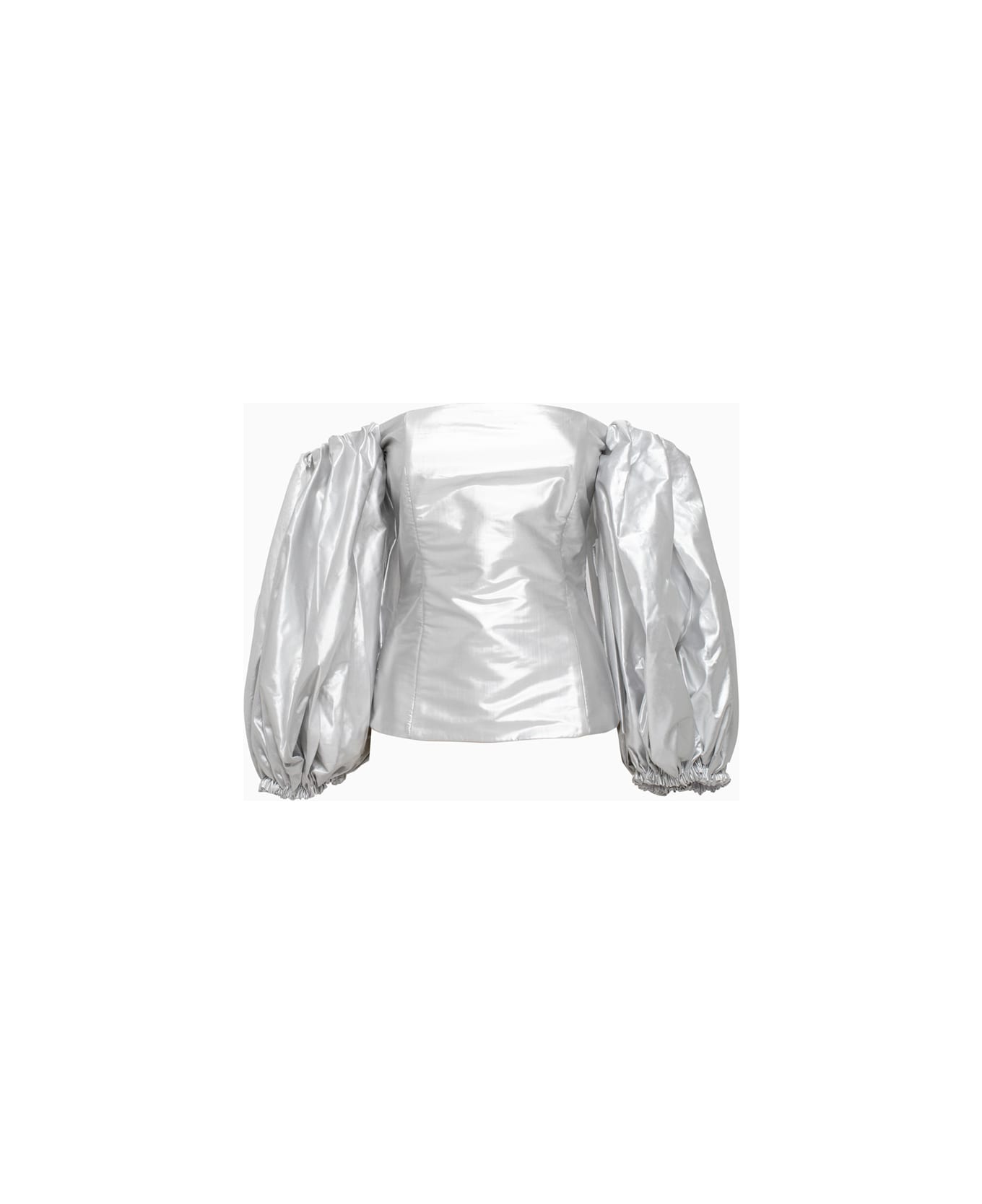 off-shoulder top in solid color silk. geometric-cut neckline with open shoulders. extra-puffy sleeves, elasticated cuffs. back concealed zipper closure. contrast-color lining. regular fit. composition: 100% silk.